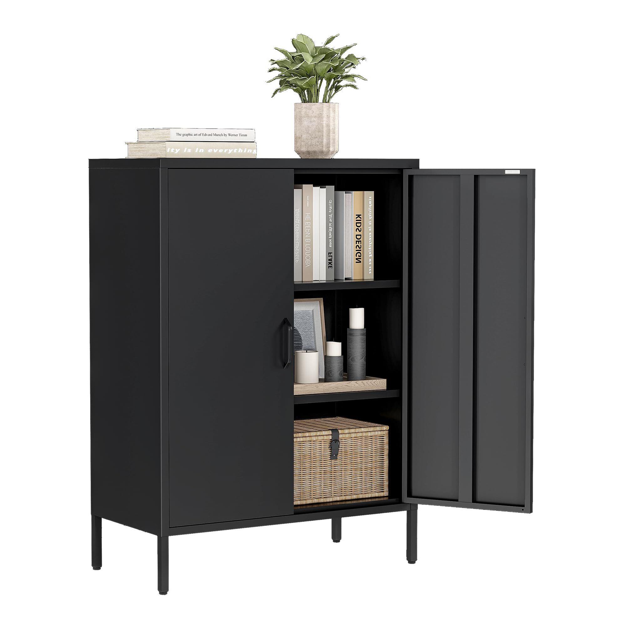 キャビネット スチール サイドボード 収納棚 扉付き 可動棚 大容量 リビング キチン ダイニングルーム 寝室用 幅80CM 組立品 (光沢面, ブラック)