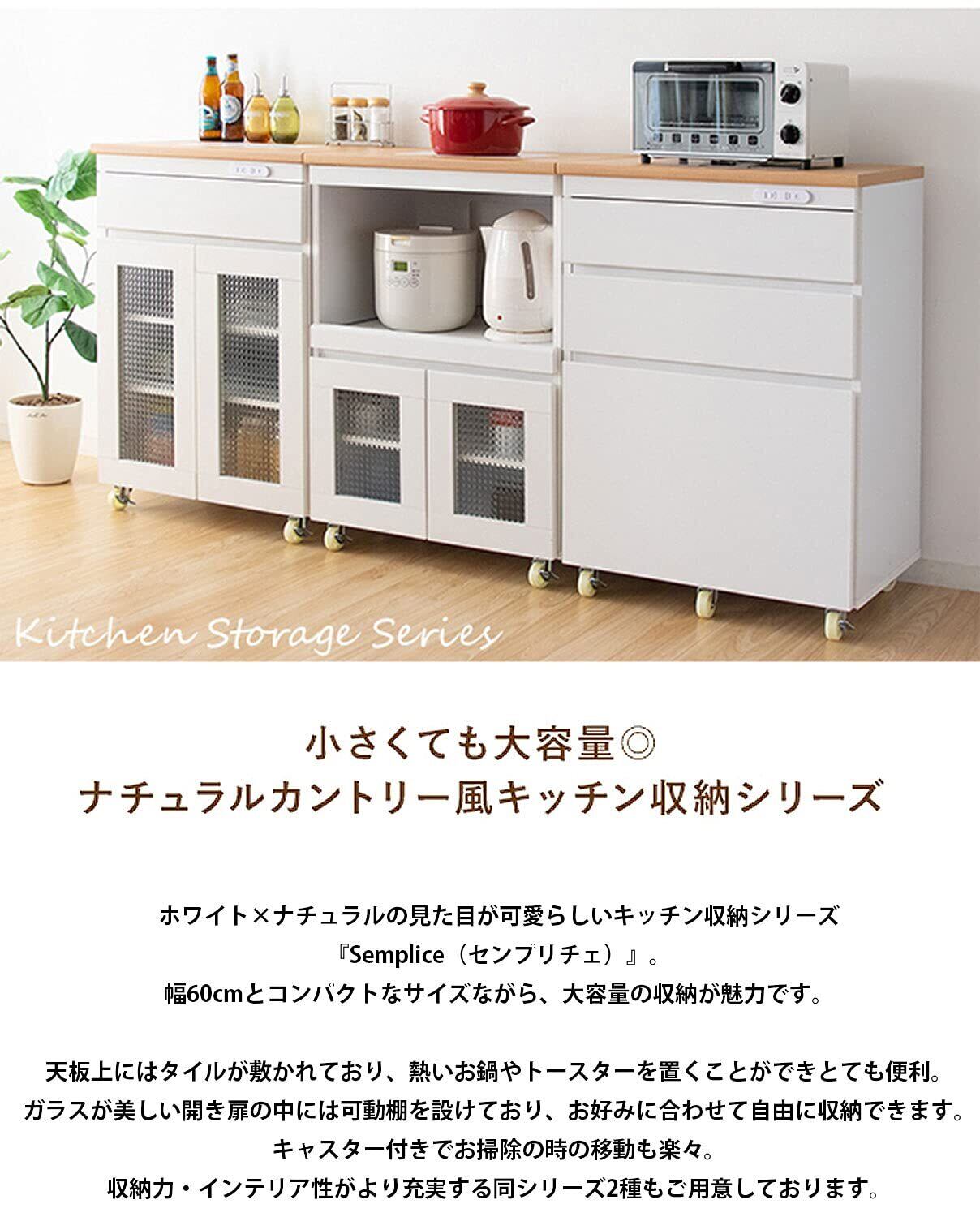 ホワイト×ナチュラルの見た目が可愛らしいキッチン収納シリーズ『Semplice(センプリチェ)』。幅60cmとコンパクトなサイズながら、大容量の収納が魅力です。天板上にはタイルが敷かれており、熱いお鍋やトースターを置くことができとても便利。ガラスが美しい開き扉の中には可動棚を設けており、お好みに合わせて自由に収納できます。キャスター付きでお掃除の時の移動も楽々。収納力・インテリア性がより充実する同シリーズもご用意しております。