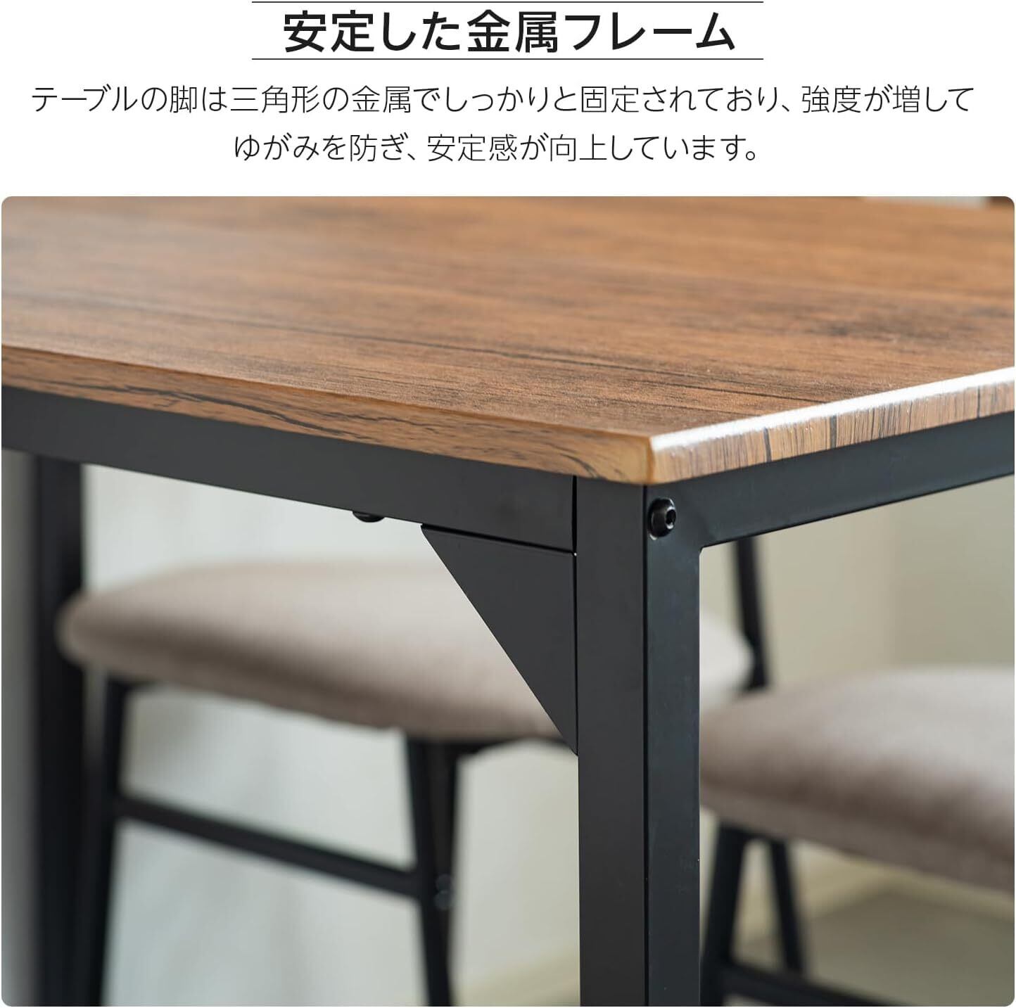 スムーズな角丸デザイン:天板の角と背もたれは、頑丈でありながらも丸みをつけた角丸デザインです。鋭角によるダメージも少ないので、お子さまがいるご家庭にもオススメです。テーブルの脚を三角形の金属でしっかりと固定し、強度を増し、ゆがみを防ぎます。安定感が増します。