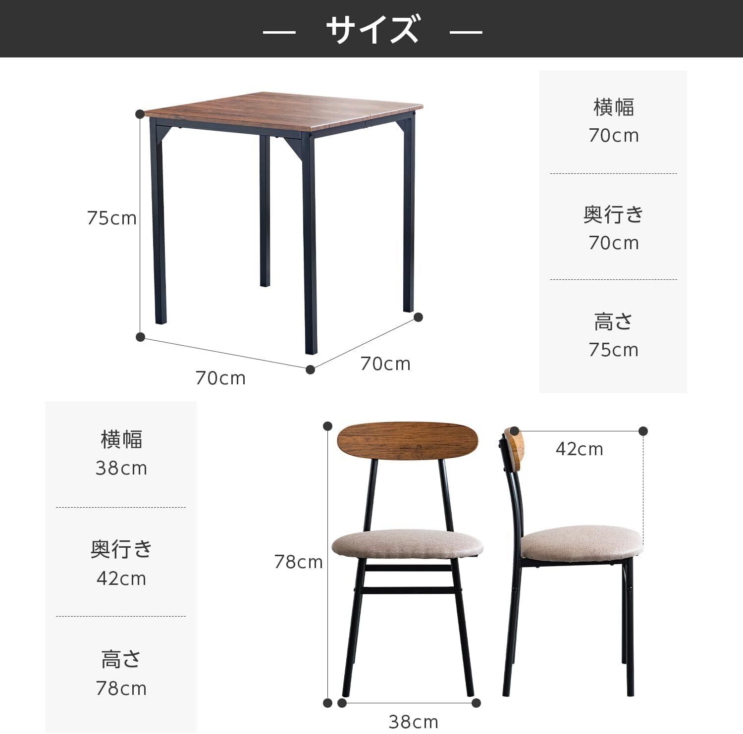 サイズ:テーブル(約)幅70X奥行70X高さ75cm、チェア(約)幅38X奥行42X高さ78cm。カラー:ブラウン、ナチュラル、ウォールナット 。