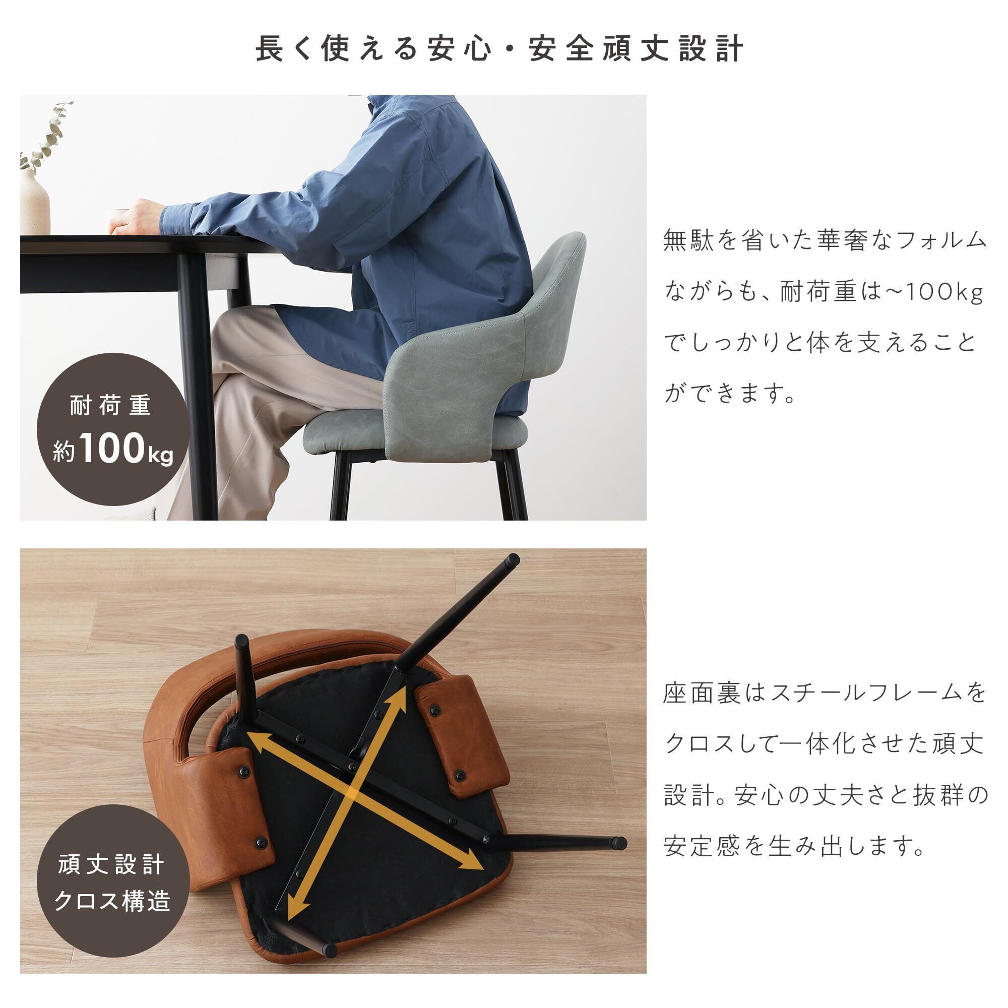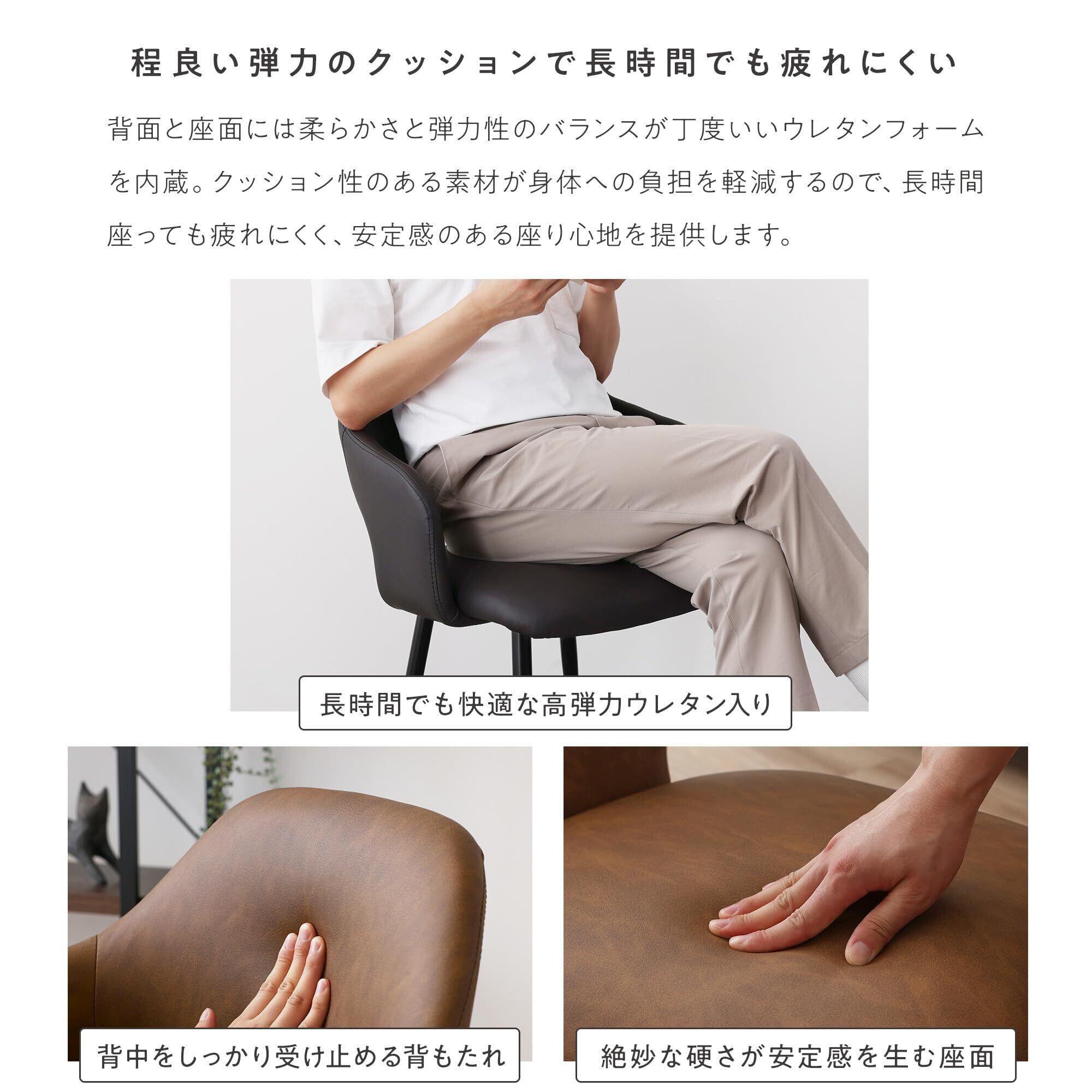 【インテリアに深みと落ち着きをプラスする上質なPUレザー】座面と背面には、味わい深い風合いを生むエイジング加工が施されたPUレザーを使用。長年使い込まれたヴィンテージ感漂う本革のようなリアルな質感は、ダイニングチェアをシックで上品な印象に仕上げ、インテリアに深みをプラスします。しっとりと滑らかな手触りで触り心地も◎撥水性にも優れているので、食べ物や飲み物をこぼしてしまってもサッと拭き取ることができ、ダイニングでも安心してお使いいただけます。