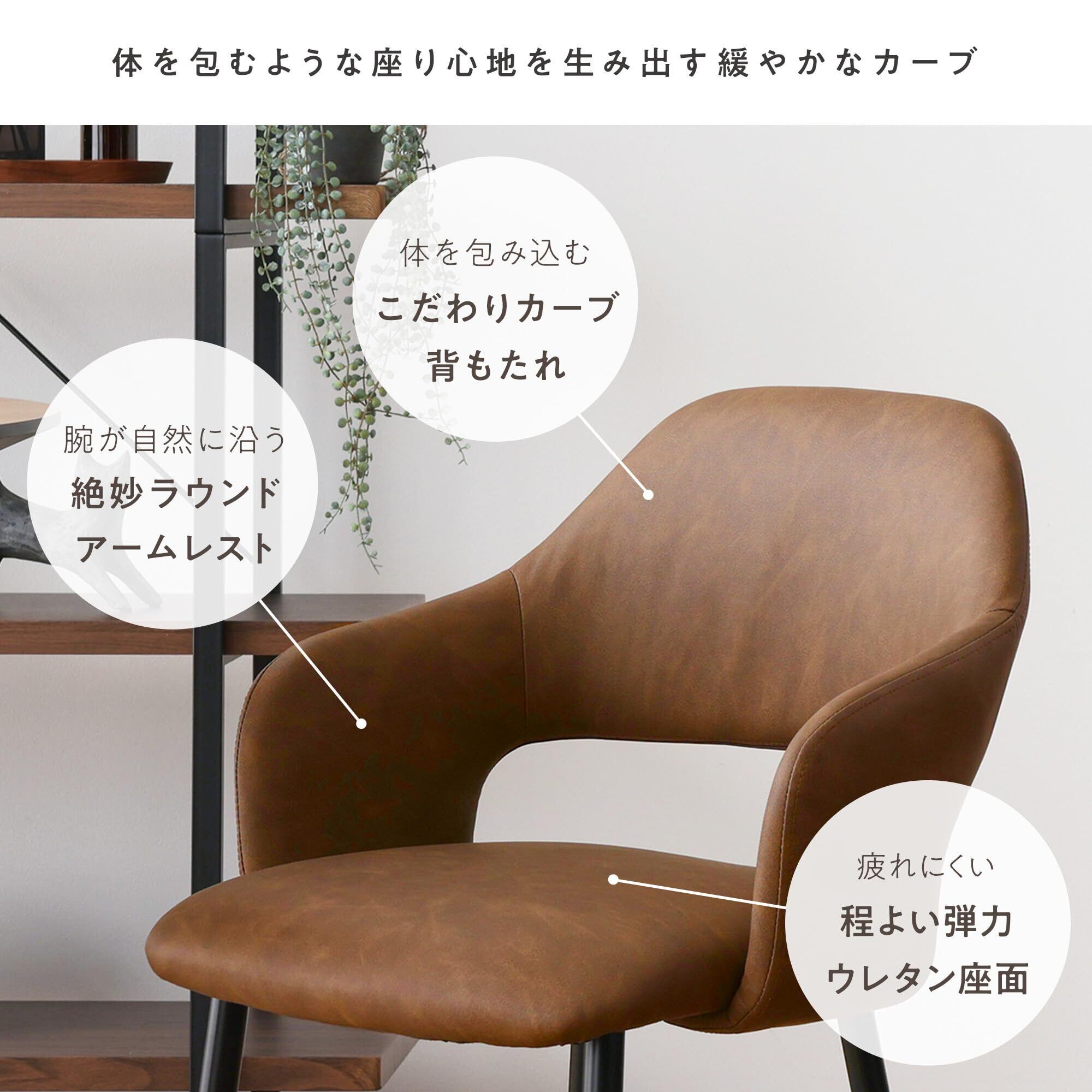 【体を包むような座り心地を生み出す緩やかなカーブ】 緩やかなカーブの背面と座面のフィット感で、まるで体を包み込まれているような感覚にさせるダイニングチェア。座ると自然と腕が添えられるアームレスト付きで、より深くリラックス感を高めてくれます。長さを抑えたハーフアームなのでテーブルの出入りがしやすく、立ち座りの際に邪魔になりにくいのも嬉しいポイント。