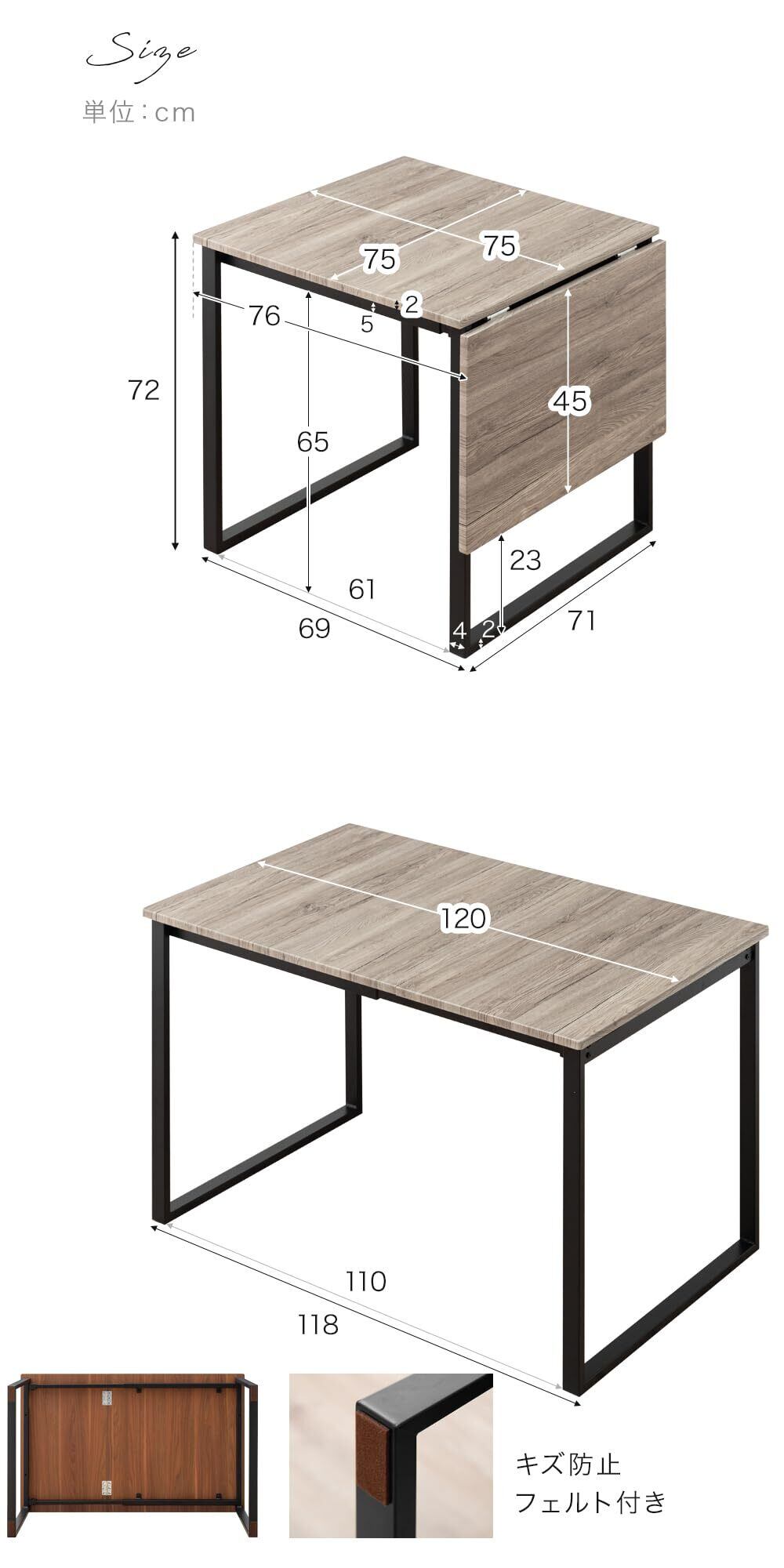 ✨【幅75cmから幅120cmへ!】このテーブルは伸長式で、必要に応じてサイズを調整できます。2人掛けの通常サイズから、ゲストが増えた際には広めに設定できるため、食事をより楽しむことができます。