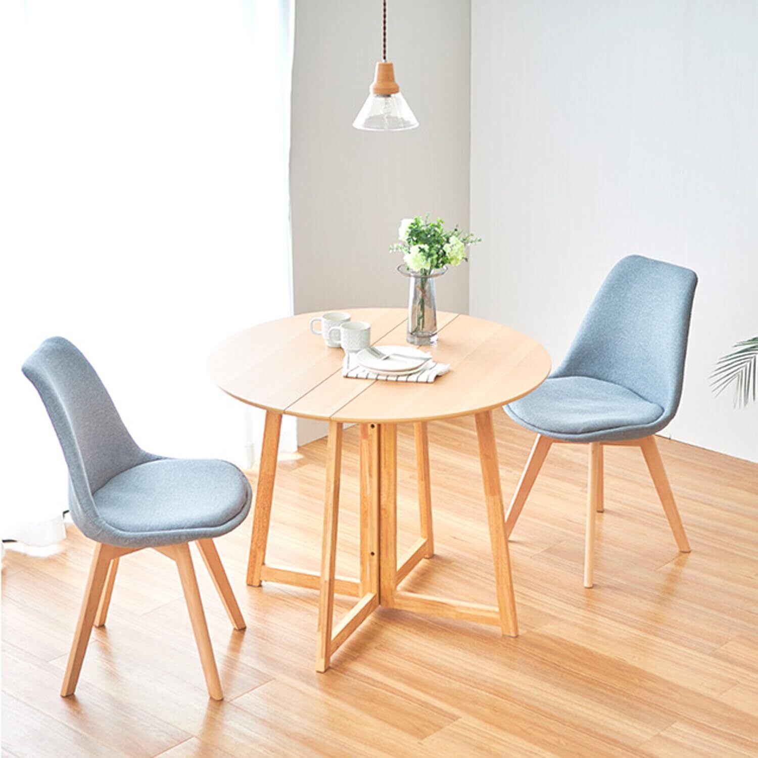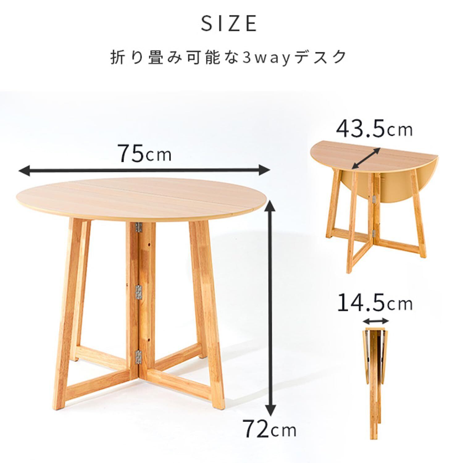 直径75cmの円形折り畳みテーブル。 1~2人での使用が可能。 天板の両側がたためる仕様。 片方を折り畳み半円での普段使い、円形に広げて使用来客や作業に対応。 収納時の折り畳みサイズは幅14.5cmになり、コンパクト収納となる。 天然木を使用し、天板はしっかり面取り加工をしているため、小さなお子様でも安心。
