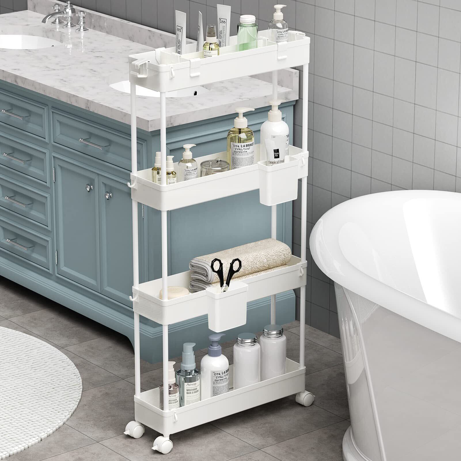 SPACEKEEPER キッチンワゴン 隙間収納 スリム 13cm 収納カップ 仕切板付き 多機能 小物 食品 調味料 キャスター付き 組立簡単 浴室 台所 冷蔵庫横 4段 ホワイト