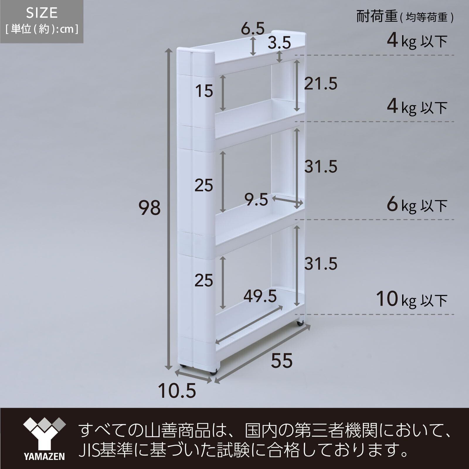 ●本体サイズ(約) : 幅10.5×奥行55×高さ98cm●カゴ内寸 : 幅9.5×奥行49.5×高さ6.5/3.5cm(カゴの壁が一方は高く、もう一方は低くなっています。)●内寸高さ : 上/21.5 中/31.5 下/31.5cm●耐荷重(均等荷重) : 棚板(上段)/4kg以下、棚板(中段 上)/4kg以下、棚板(中段 下)/6kg以下、棚板(下段)/10kg以下●材質 : ポリプロピレン●東証プライム(株)山善で扱うすべての山善商品は、自社もしくは第三者機関において、JIS規格に基づいた品質試験を行っております。