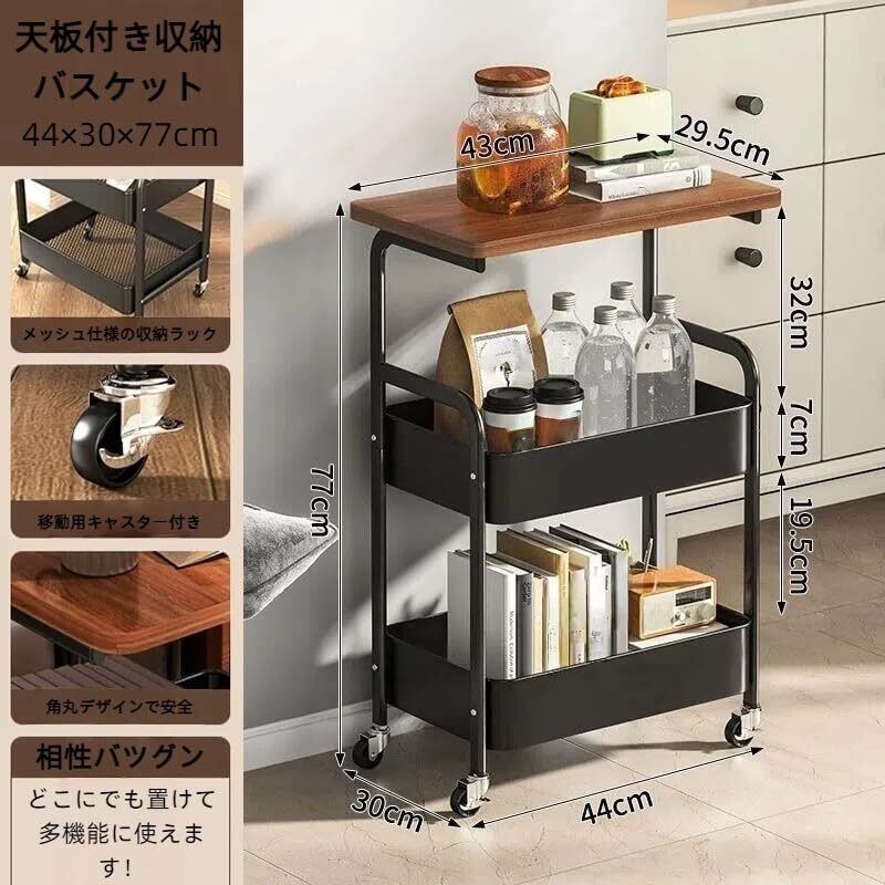 【三段式の収納スペース】キッチン収納ワゴンは天板と2段のバスケットによる三段式デザインを採用しており、収納スペースが十分に確保されています。特に2段目のバスケットから木製の棚板までの間隔が広く設計されています。 トースター、炊飯器、調味料、キッチン用品、収納バスケット、食品などをまとめて保管でき、キッチン収納ラックとして調理器具やキッチン用品などをすっきり整理することができます。