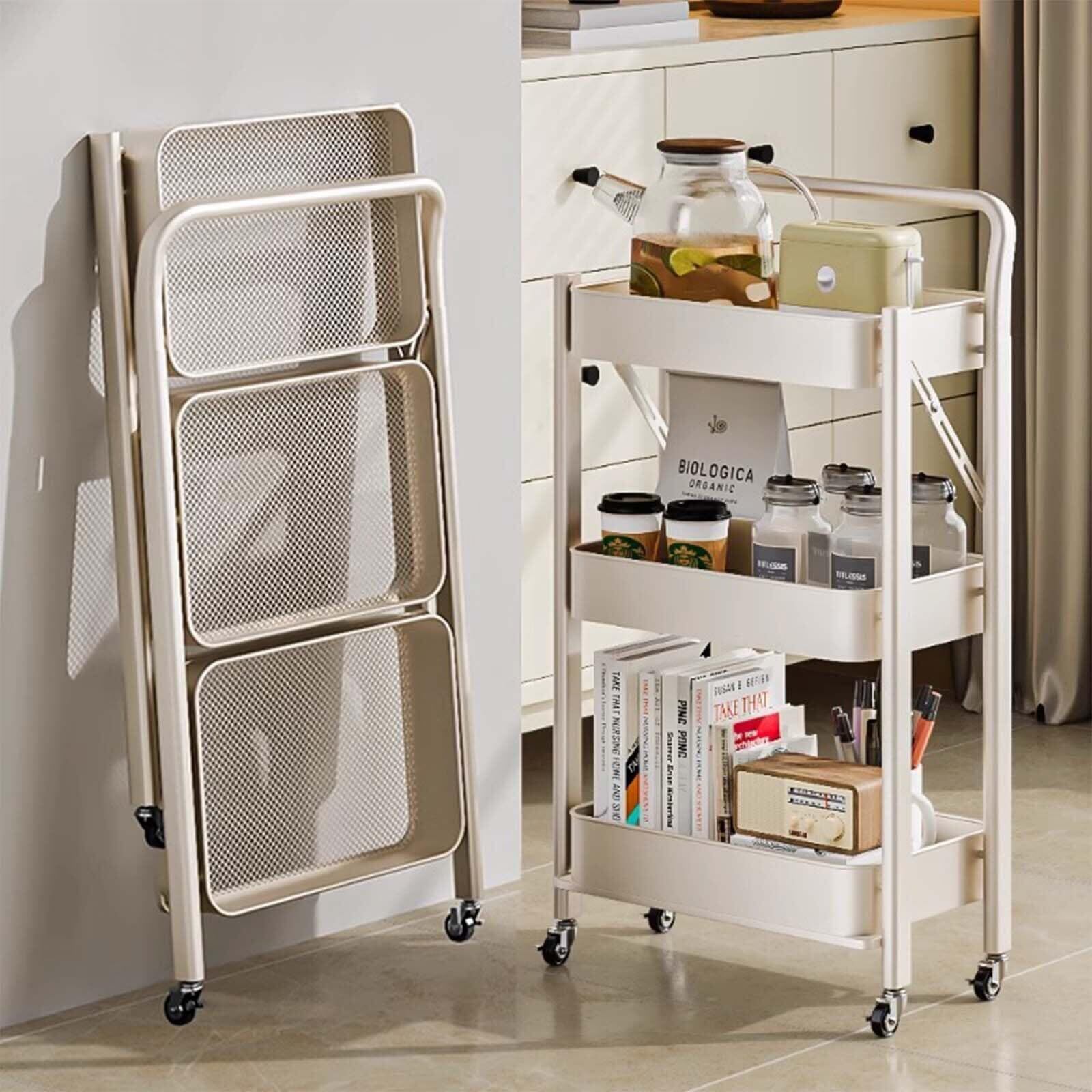【組立不要・折り畳み式ラック】折りたたみキッチンワゴンは普通の収納ワゴンとは異なり、面倒な組み立ては必要がありません。手間がかからず、キャスターとハンドルを簡単に付ければ、すぐに使用できます。使わないときにも、折りたたんで部屋の狭いスペースに収納することができます。生活空間を占用せず、空間利用率を最大限にする、非常に便利なスチールラックです。