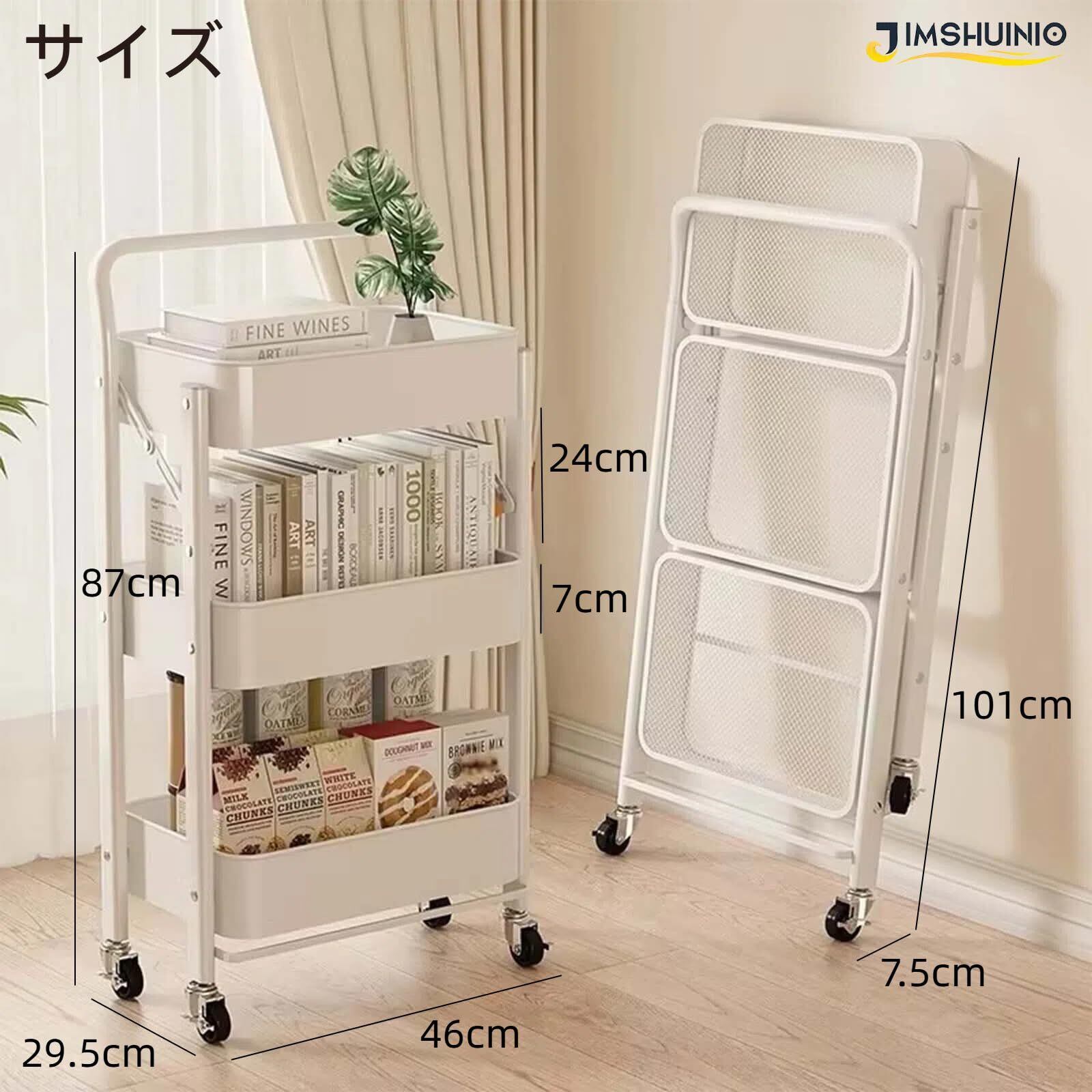 ✨【省スペースで便利な収納!】幅46cm、奥行29.5cm、高さ87cmのスリムなデザインで、キッチンやリビングなどの限られたスペースにフィットします。折り畳み式なので、使用しないときは簡単に片付けができるのも魅力です。