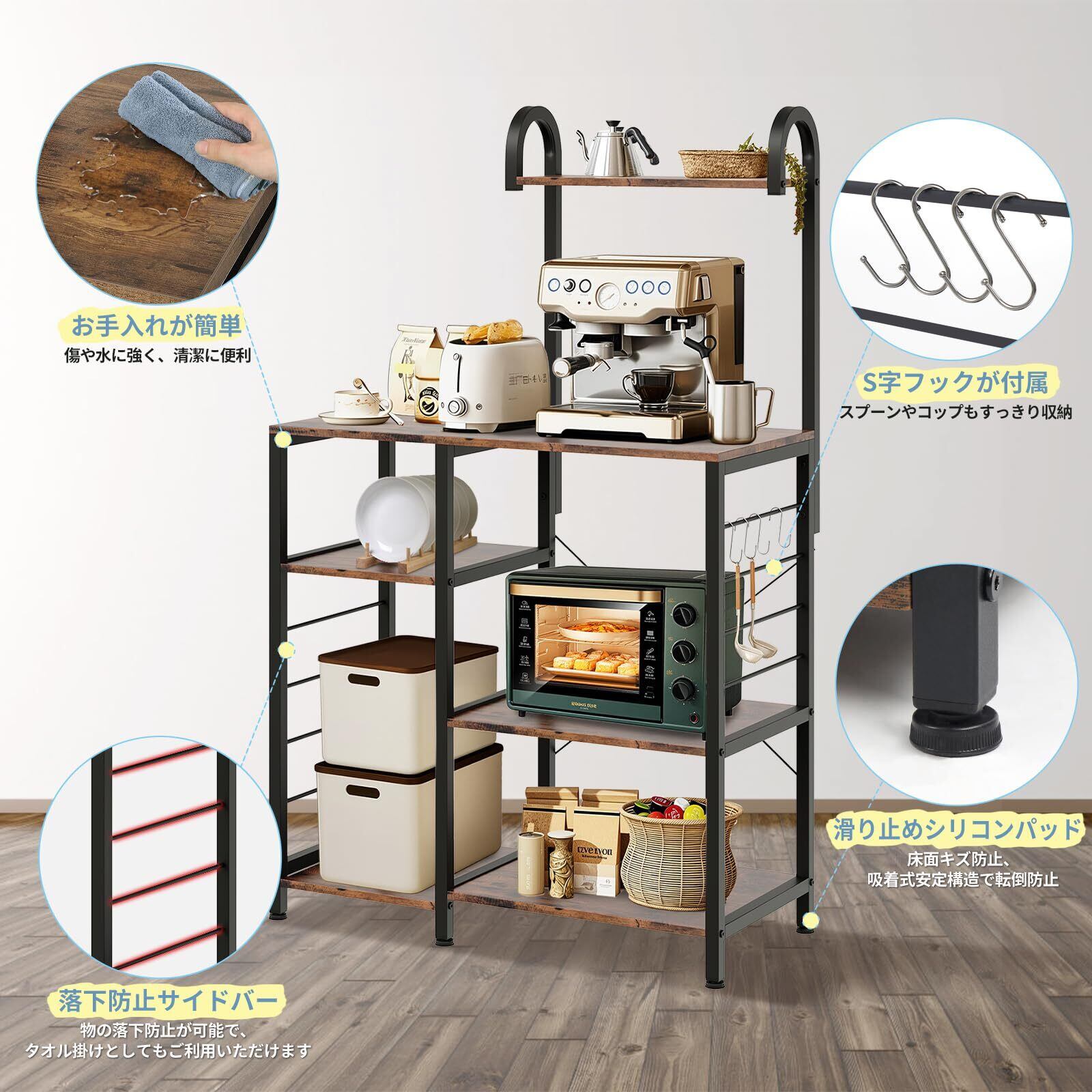 [SuperKois] レンジラック キッチンラック レンジ台 食器棚 頑丈 高耐荷設計 大型レンジ対応 キッチン棚 キッチン収納 レンジボード キッチンカウンター 棚 耐荷重100kg 組み立て簡単 S字フック4個付き 高さ142*幅80*奥行40cm 省スペース (ブラウン)
