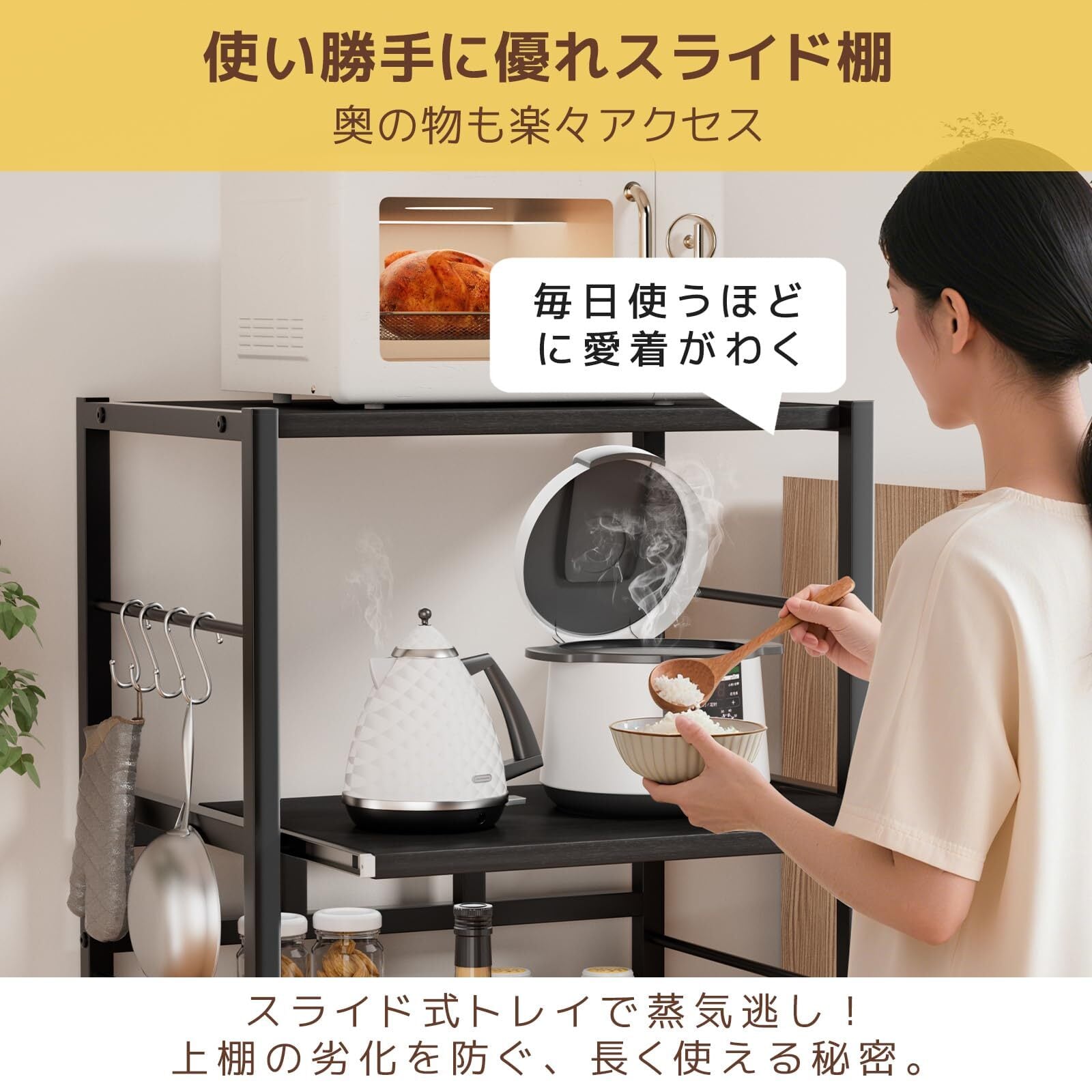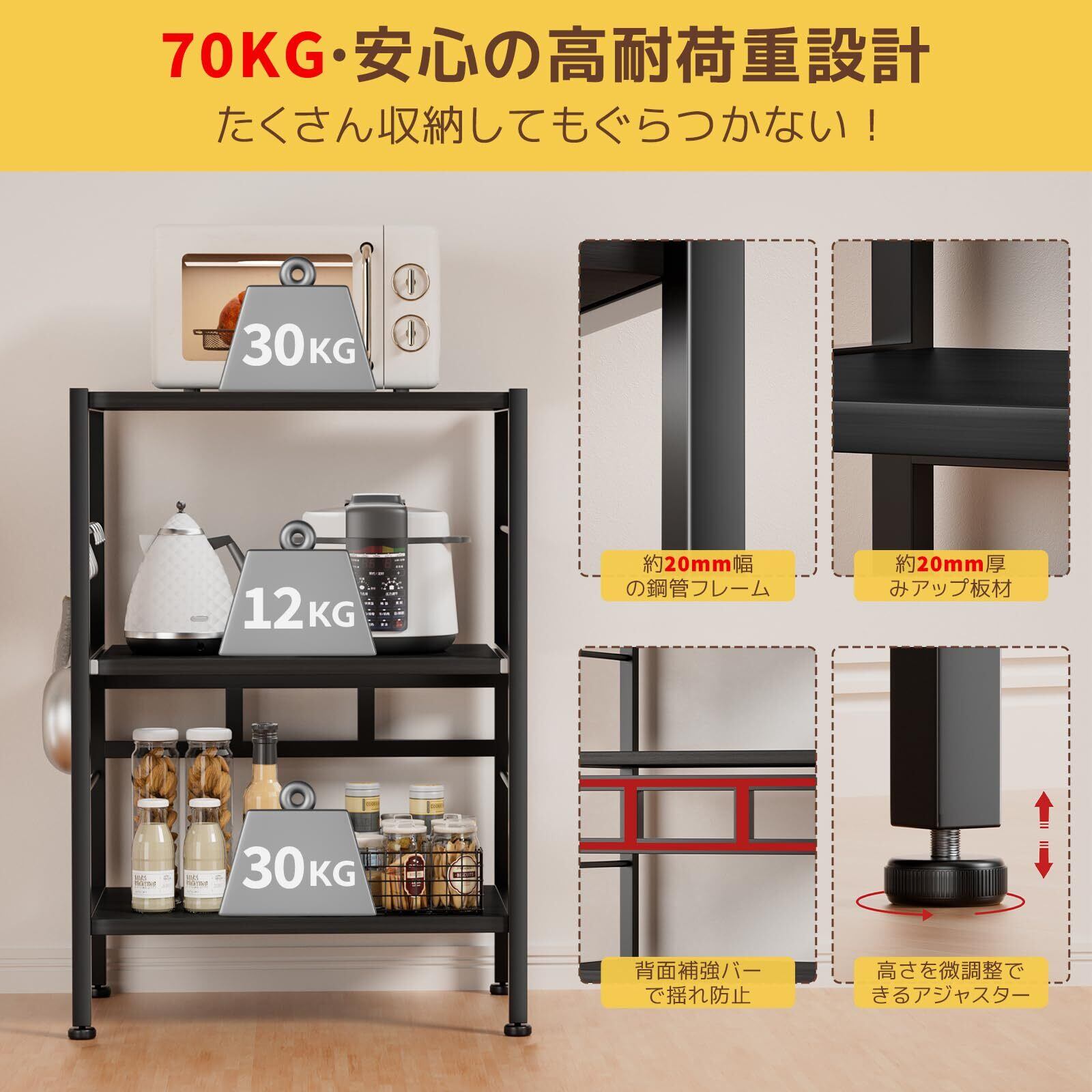 【多機能収納ラック&充実の収納力】このキッチンラックは3段構造を採用しており、電子レンジ、調味料、食器類などをすっきりと整理して収納できます。耐荷重約30kgの棚板で大型レンジまでも安全に置けます。さらに、タオル掛けや4つのS字フックも付属しており、調理器具や小物を整理して収納でき、キッチンスペースを最大限に活用できます。中段の棚板はスライド式になっており、炊飯器や電気ケトルなど蒸気を発する家電を置く際に引き出すことで、蒸気が上段の棚板に当たらず、棚板のカビや劣化を防ぐことができ、使用寿命を延ばします。