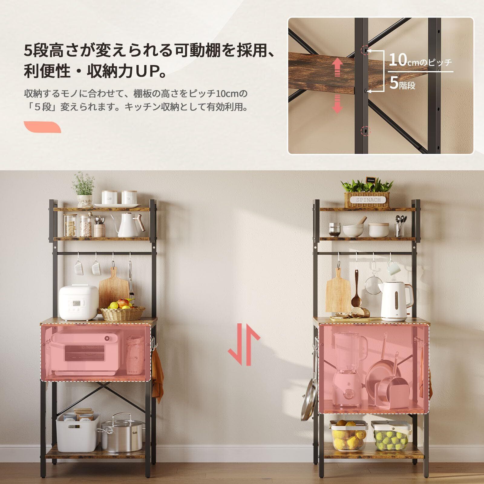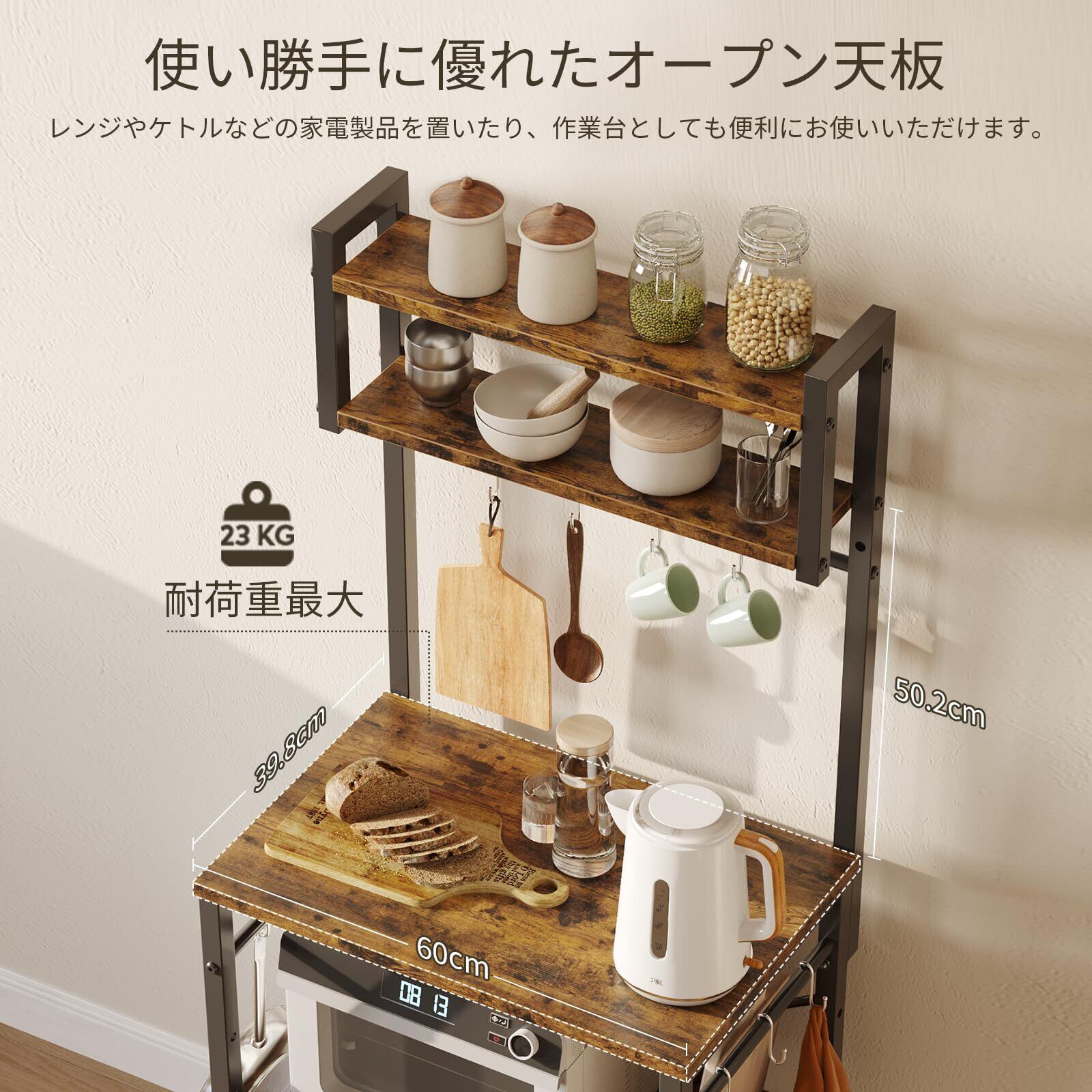 【全5段の棚板で充実の収納力】限られたスペースに5段キッチン収納ラック!2つの上棚で調味料を手軽に取り出せて便利です。耐荷重約23kgの大天板で大型レンジまでも安全に置けます。高さ調整可能な2つの下段棚板も採用、キッチン家電、食器、キッチン用品をまとめて収納できます。10個のS字フックも付属しており、キッチンの小物を整理整頓。デッドスペースを無駄なく幅広い用途に対応、使いやすいキッチンを