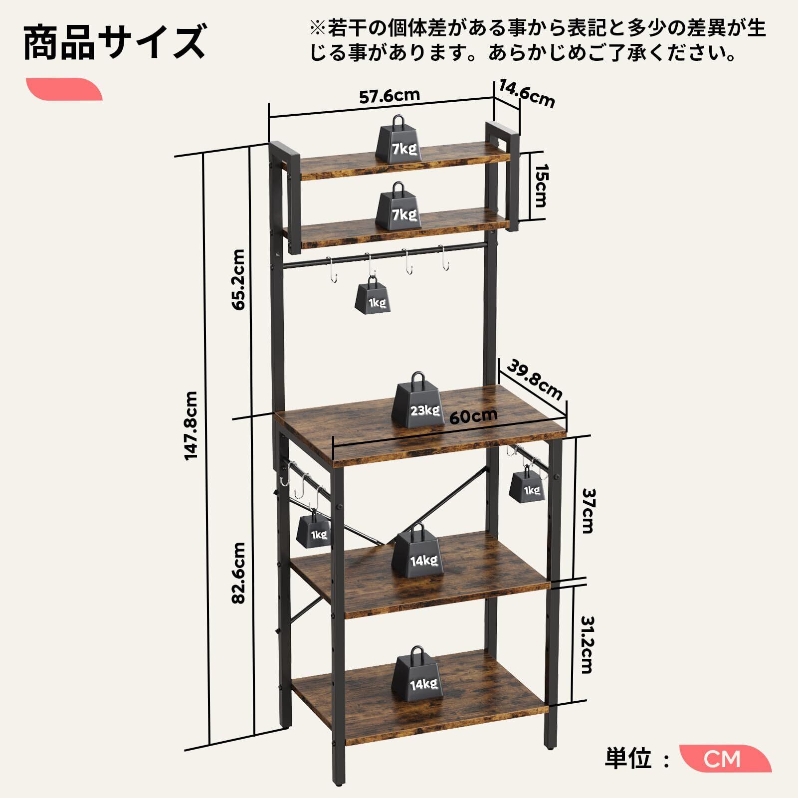 【商品仕様・一年付き】◆レンジラックの本体サイズ:幅60×奥行41.6×高さ147.8cm、梱包サイズ:94×46×13.5cm。◆材質:パーティクルボード(メラミン加工)、スチール(フレーム)◆本体重量:約11.65kg、梱包重量:13.15kg。◆長くお使い頂ける高い耐荷重設計:7kg、7kg、23kg、14kg、14kg。※お客様組立て品です。