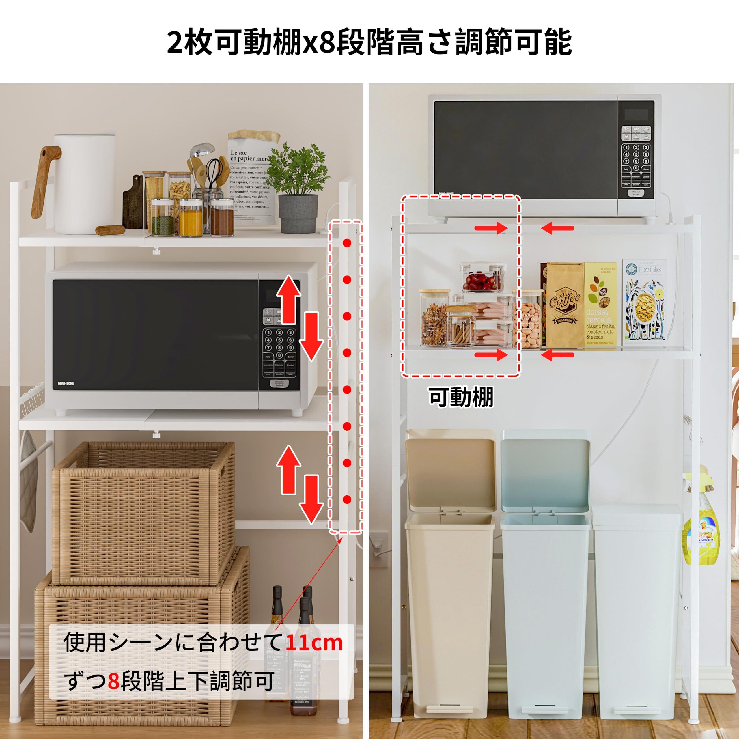 ✨本ラックにはコンセントが付いており、電子レンジや炊飯器などの電源を簡単に確保できます。キッチンでの電力確保がスムーズになり、家事をより快適に行えます。