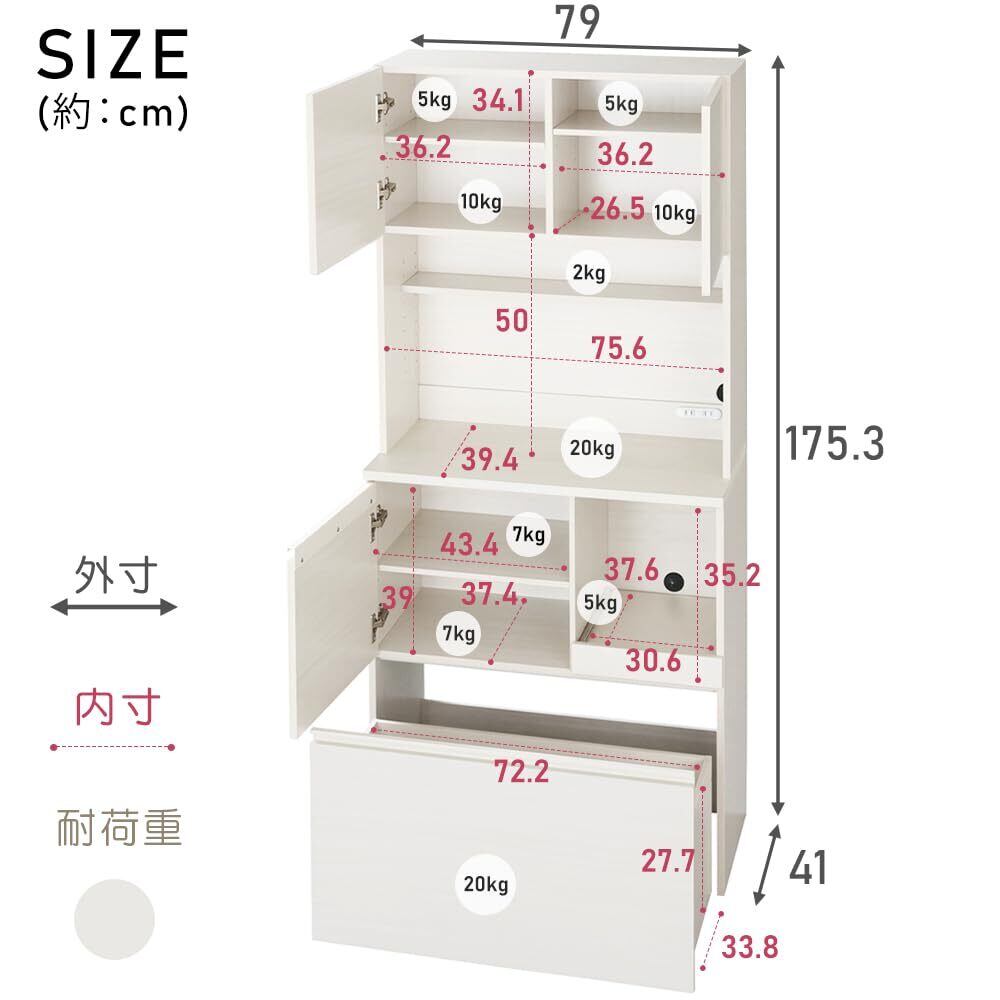 製品サイズ(cm):本体外寸…幅約79×奥行約41×高さ約175.3/引き出し内寸…幅約72.2×奥行約33.8×高さ約27.7/スライド棚内寸…幅約30.6×奥行約37.6×高さ約35.2