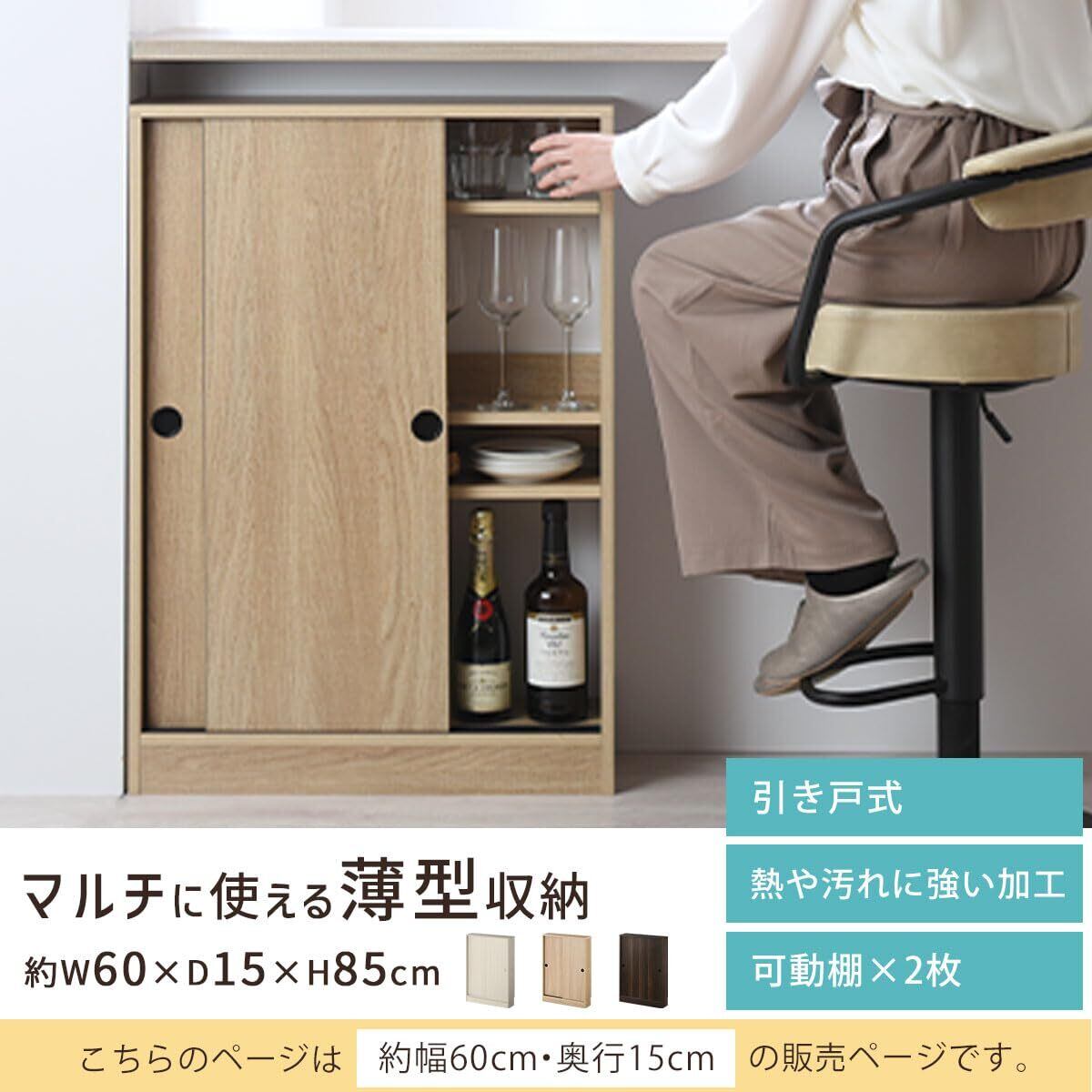ぼん家具 カウンター下収納 奥行15cm 引き戸 幅60cm 薄型 キッチン収納 マルチラック キャビネット ウォールナット
