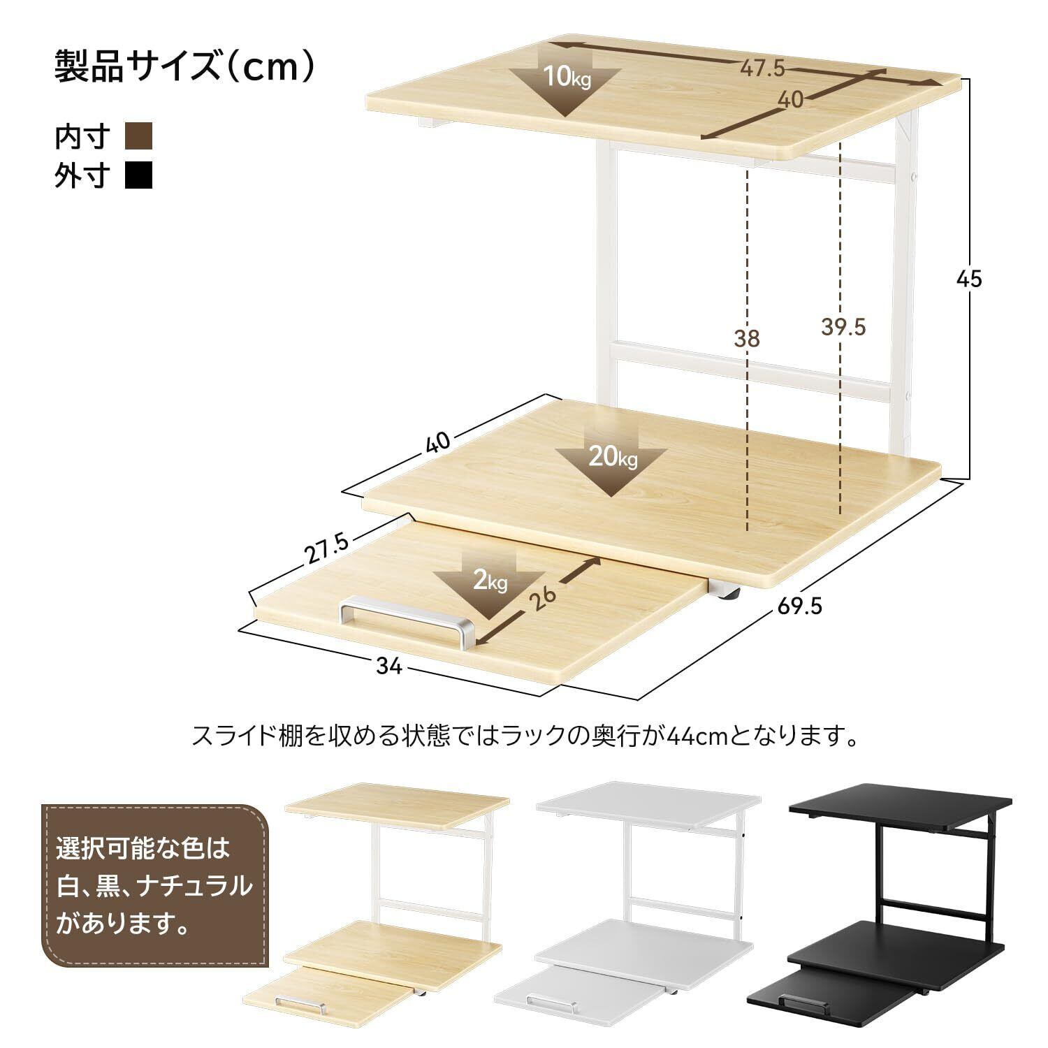 【商品仕様】商品サイズ:幅47.5×奥行43.5-69.5×高さ45cm、棚板サイズ:幅47.5×奥行40cm。各層棚耐荷重:上段棚板:約10kg、下段棚板:約20kg、スライド棚板:約2kg。ラックの幅は47.5cmなので、市販のほとんどの小型冷蔵庫に対応できます。