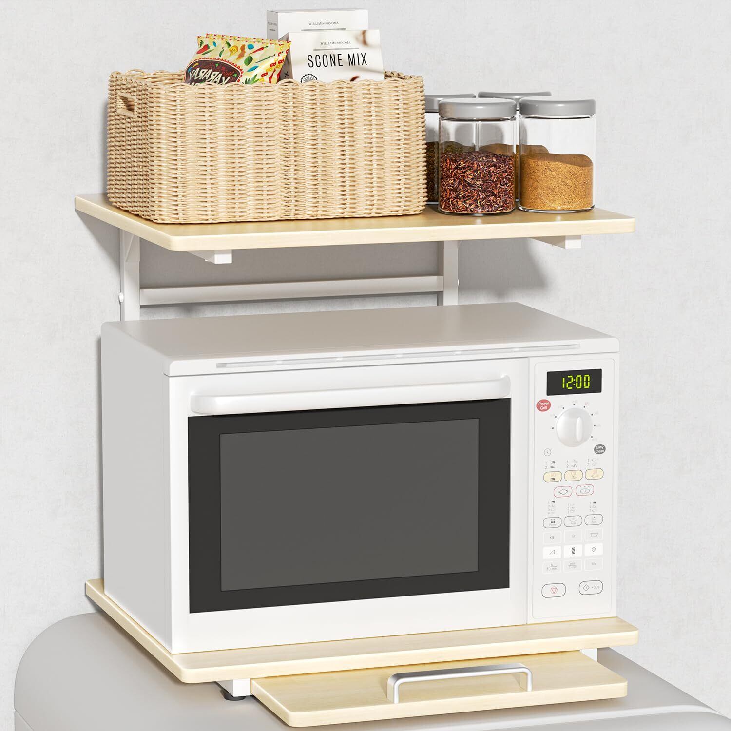 ✨スライド棚を搭載しており、収納物の出し入れが簡単です。特に電子レンジなど頻繁に使用するアイテムをスマートに収納できるため、毎日の料理がより快適になります。