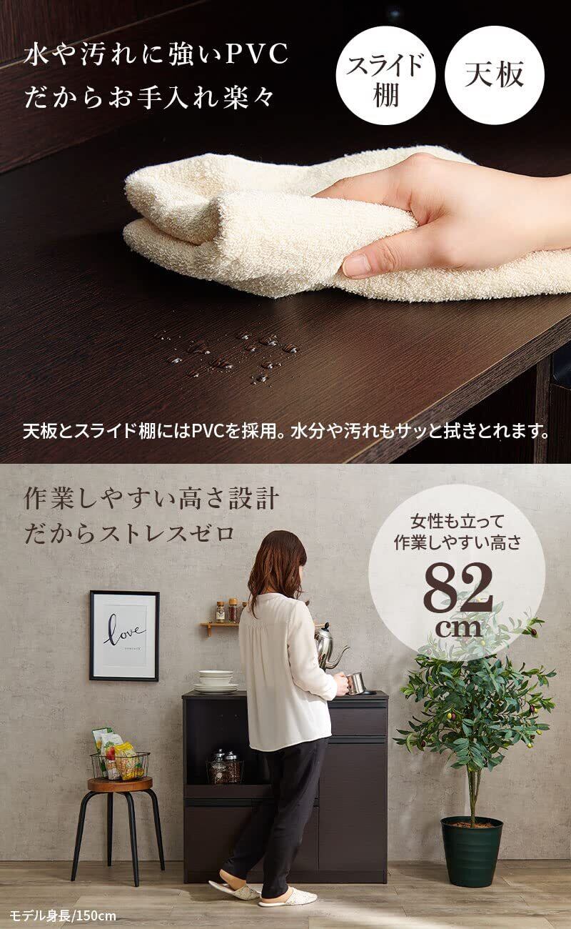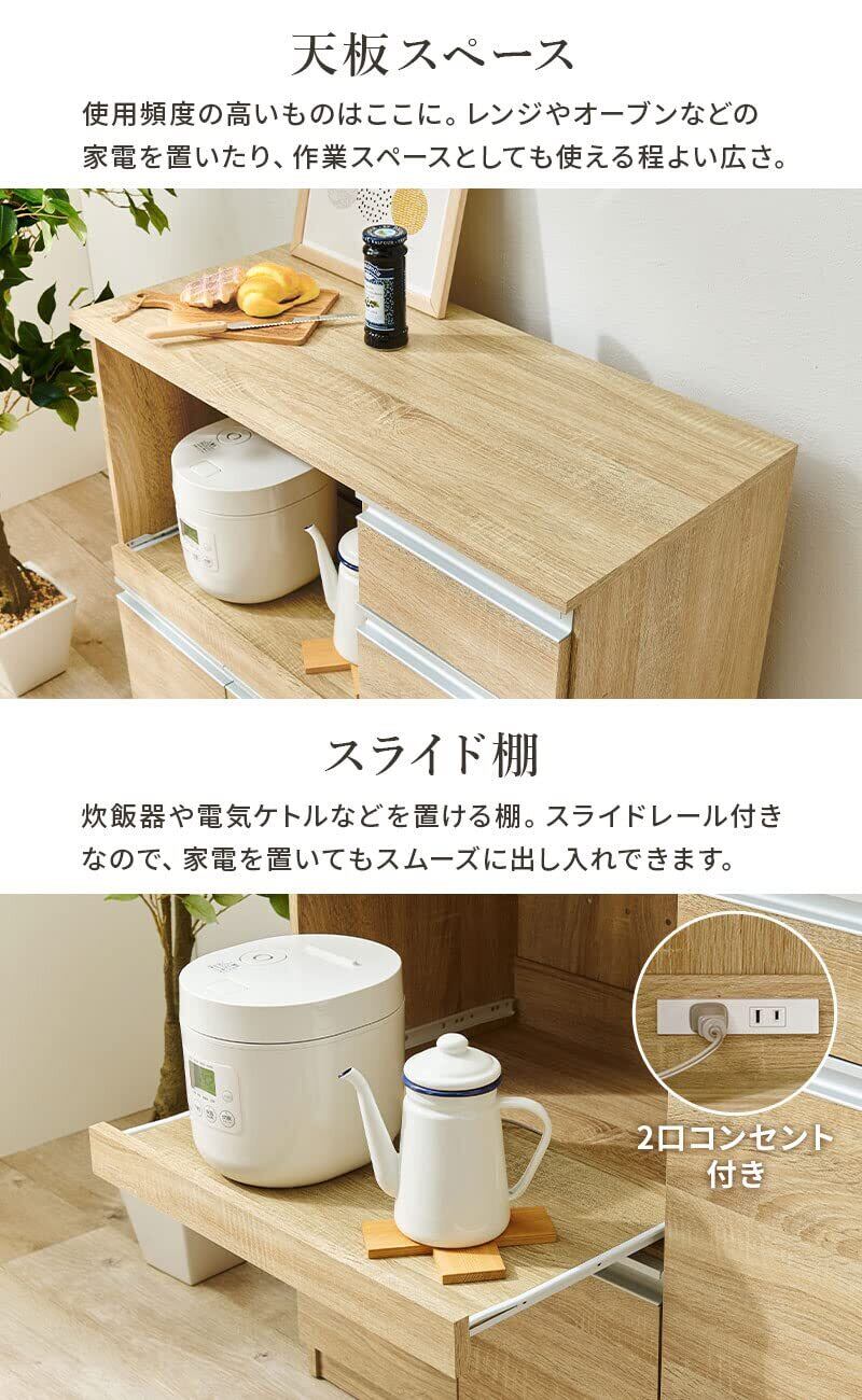 ✨幅89cmの広々としたデザインは、食器や調理器具をたっぷり収納できるため、キッチンのスペースを有効活用できます。重たい家電や大きな食器も安心して収められます。