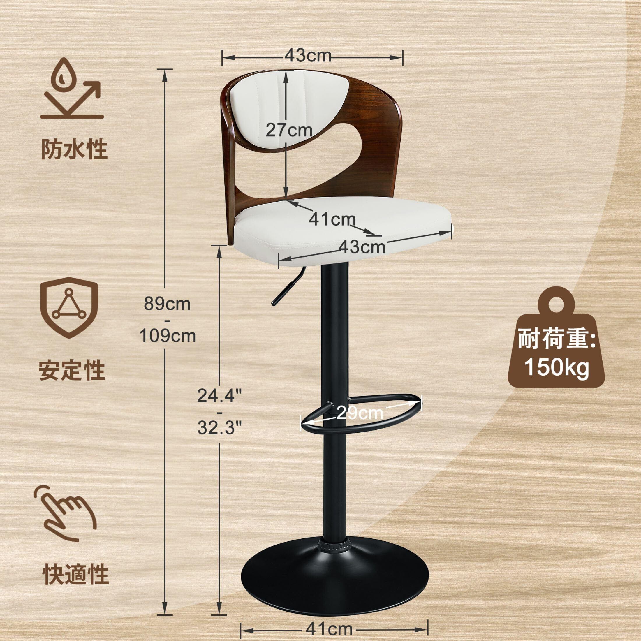 【サイズ】幅43.5㎝×奥行き43㎝×高さ89-109㎝ 【材質】PUレザー 、スチール(メッキ加工) 【梱包サイズ】54×46×48㎝