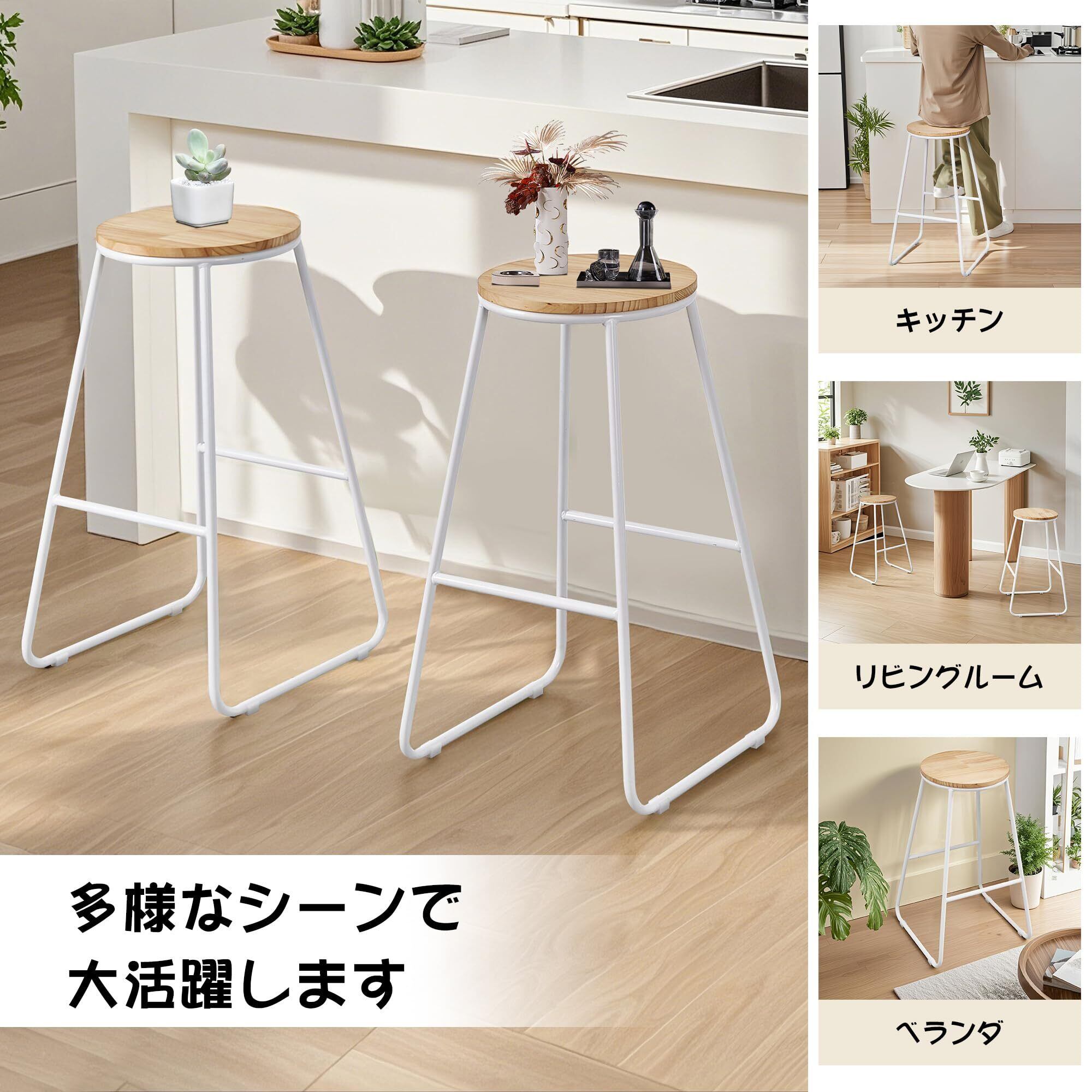 【耐久性&安定性】座面は高品質のマツ材で加工されており、脚部は耐久性のあるスチール製です。これにより、非常に安定したバースツールが実現し、変形や破損しにくく、長期間使用できます。ニス塗装仕上げで、カビに強く、長期間使用できます。脚裏には床傷防止マットが付いているため、滑り止め効果があり、床を傷つけにくいです。