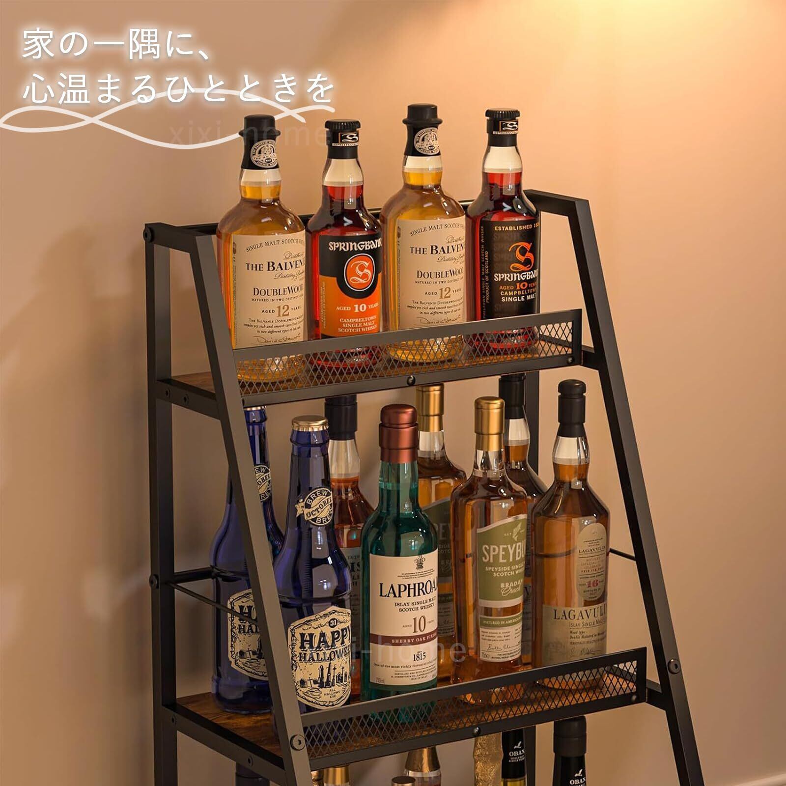 ワインバーキャビネット 木製 3段 酒棚 ディスプレイ ワインラック ワインホルダー お酒収納ラック 収納 ウイスキー ガラスホルダー付き フェンス付き おしゃれ 大容量 ウイスキー棚 ラック 棚 テーブル 収納ラック