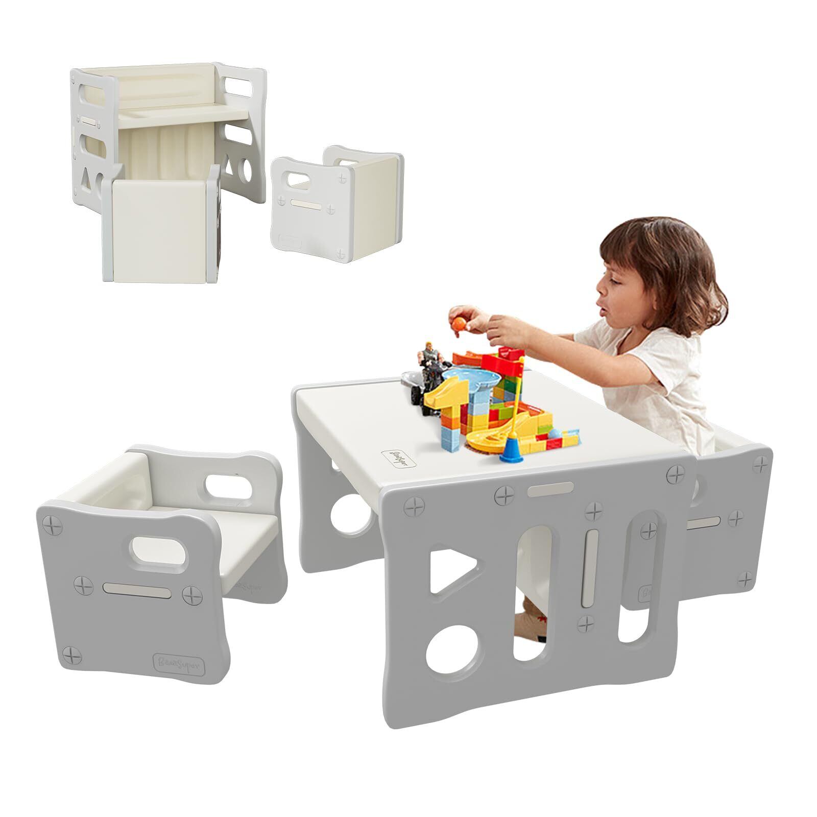 BanaSuper 子供用テーブルと椅子3点セット お絵描きデスク アクティビティチェア 多機能プラスチック家具 軽量収納 組立簡単 リビング学習/絵かき/ダイニング/プレイセット ホワイトとグレー