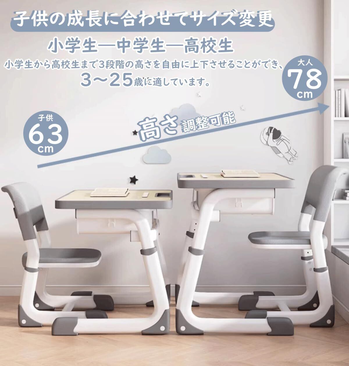 ✨【成長に合わせた高さ調節機能】この勉強机セットは、お子様の成長に合わせてデスクとチェアの高さを調節可能です。年齢や体格に応じて最適な高さに調整できるので、長期間にわたって使えます。
