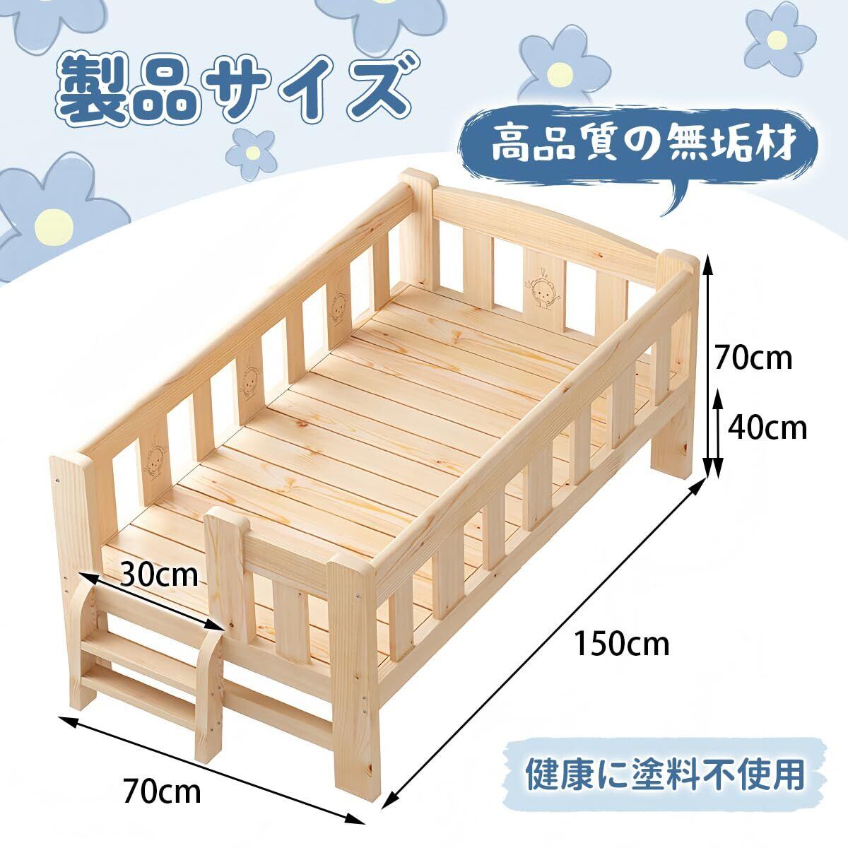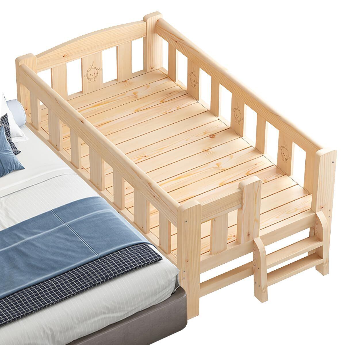 子ども用ベッド ベビーベッド 木製 子供ベッド 長さ150×幅70cm 四面 ベッドフェンス テールラダー付き 多機能 スプライシング可能 高めのガードレール 転落防止 頑丈 耐震 組み立てが簡単 子供部屋 新生児 出産祝い 日本語説明書付き(木の色)