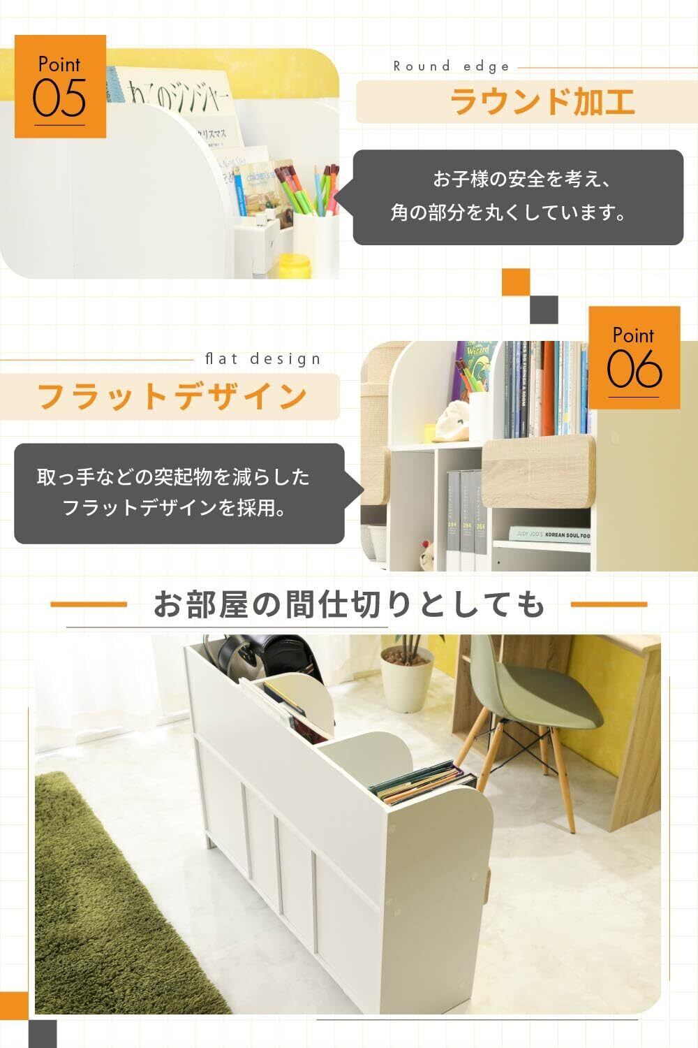 【お子様への配慮と使いやすさ】 毎日の使いやすさと、小さなお子様がいるご家庭に配慮した工夫として、角を丸く仕上げております。 高さは70cmとお子様が無理なく使える高さに設計。 各棚板は10kg、上部天板は各10kgと、絵本やおもちゃをたくさん収納してもしっかりと支える設計です。