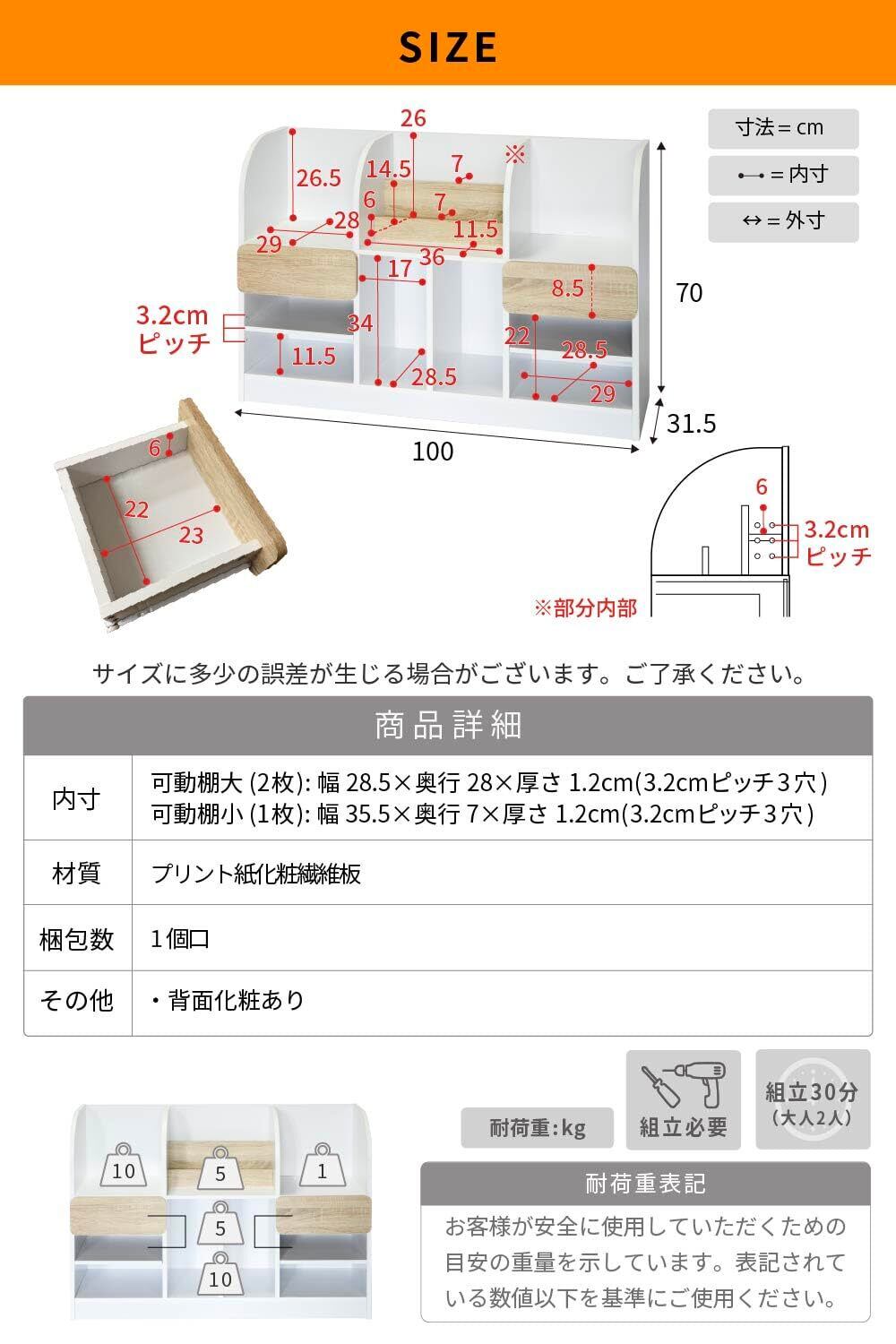 【製品仕様】 [カラー]ホワイト×ナチュラル、ホワイト×ホワイト(2色展開) [外寸]幅100cm × 奥行31.5cm × 高さ70cm [素材]プリント紙化粧繊維板(背面化粧あり) [耐荷重]上部天板:各10kg / 引き出し:5kg / 棚板:各10kg [組立]お客様組立品