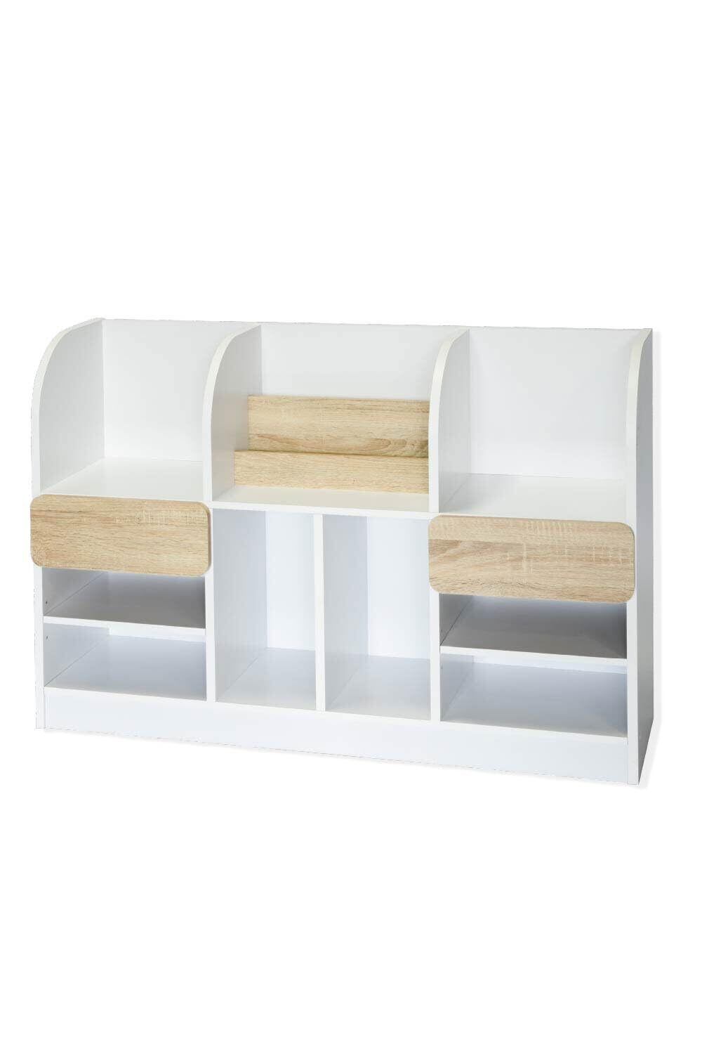 【2人でも使えるワイド設計】 幅100cmのワイドサイズで、兄弟姉妹で仲良く使えます。 上段の仕切りは、表紙が見えるように絵本を陳列できるディスプレイ収納。 下部には、ブロックやぬいぐるみなどの細々したおもちゃを隠せる引出しを両端に配置。 中央は、深さのあるおもちゃや図鑑、収納ボックスを収めるのに適したスペース。 お子様の成長に合わせてフレキシブルに活用できます。