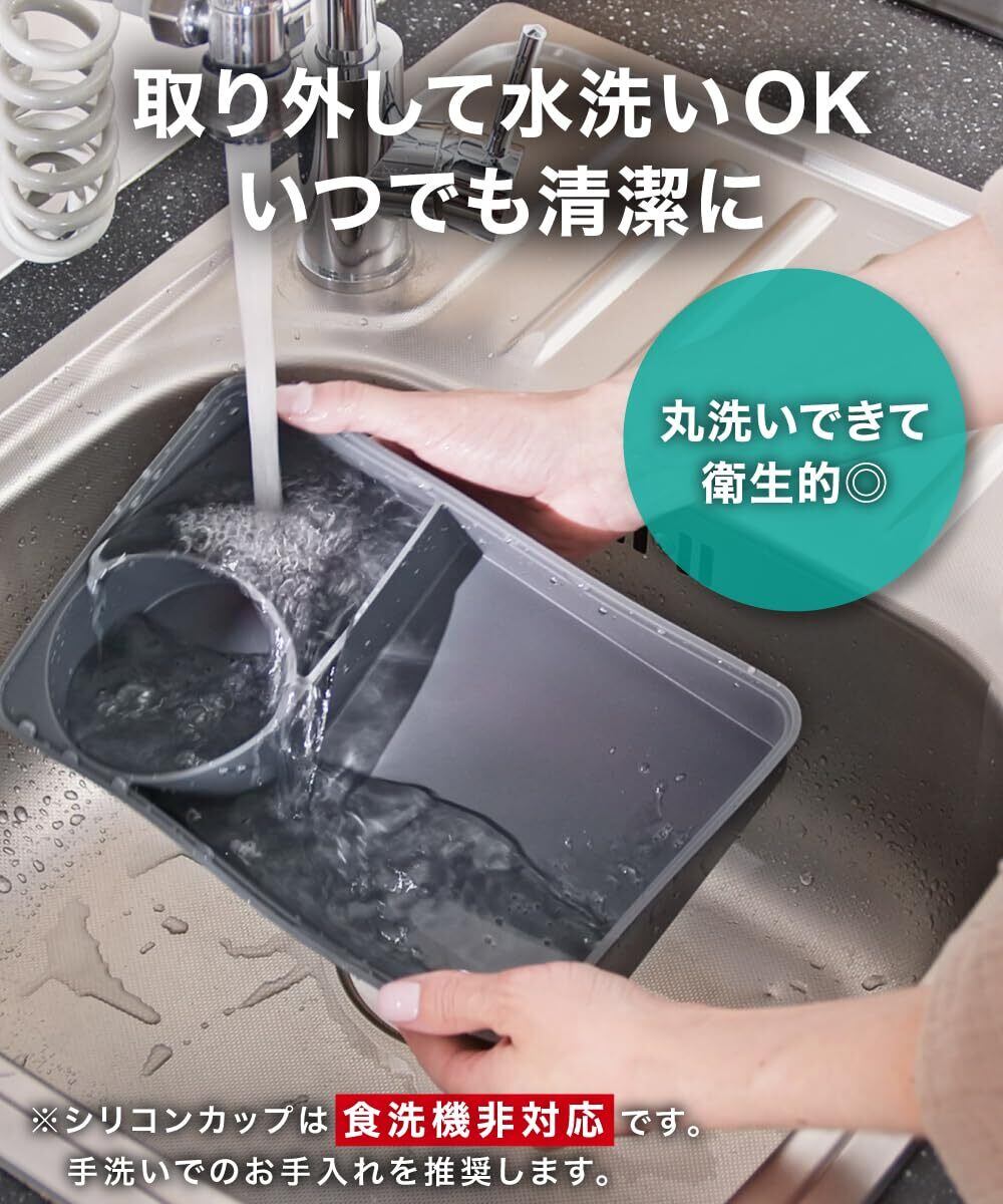 【 飲み物・おやつ・おもちゃも入れられる!洗えるカップホルダー付き 】 天板に備えたシリコン製カップホルダーは、飲み物やお菓子、おもちゃ、小物の収納に便利。不安定な場所でも倒れにくく、中身が転がりにくい安心設計。取り外して水洗いできるので、汚れても清潔に保てます。