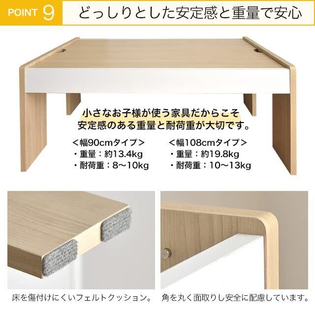 この商品は、小さな子どものために角丸加工とフェルトクッション付き脚が採用されています。天板の耐荷重は約8kgです。使用時は、これらの点に注意してください。