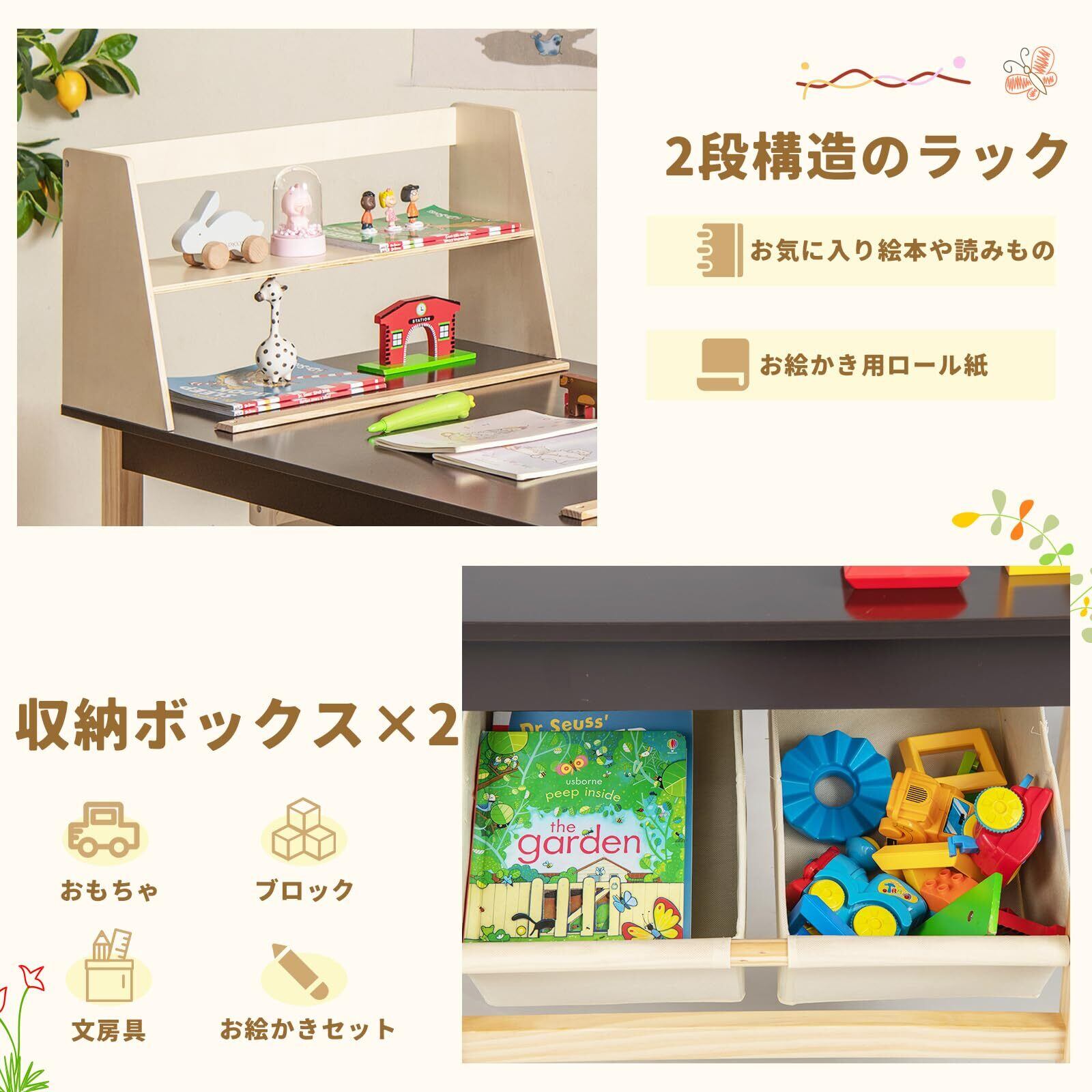 【整理整頓を学べる実用的な収納スペース】テーブルの下には取り外し可能な2つの収納ボックスが設けられており、お絵かき道具やおもちゃ、絵本などをスッキリと収納することができます。さらに、サイドに配置された2段のオープン棚には、筆立てや色鉛筆などを手の届くところに置いておけるため、お子さまが自分で道具を出し入れしやすくなっています。遊びの中で自然と片付けの習慣が身につく設計になっています。