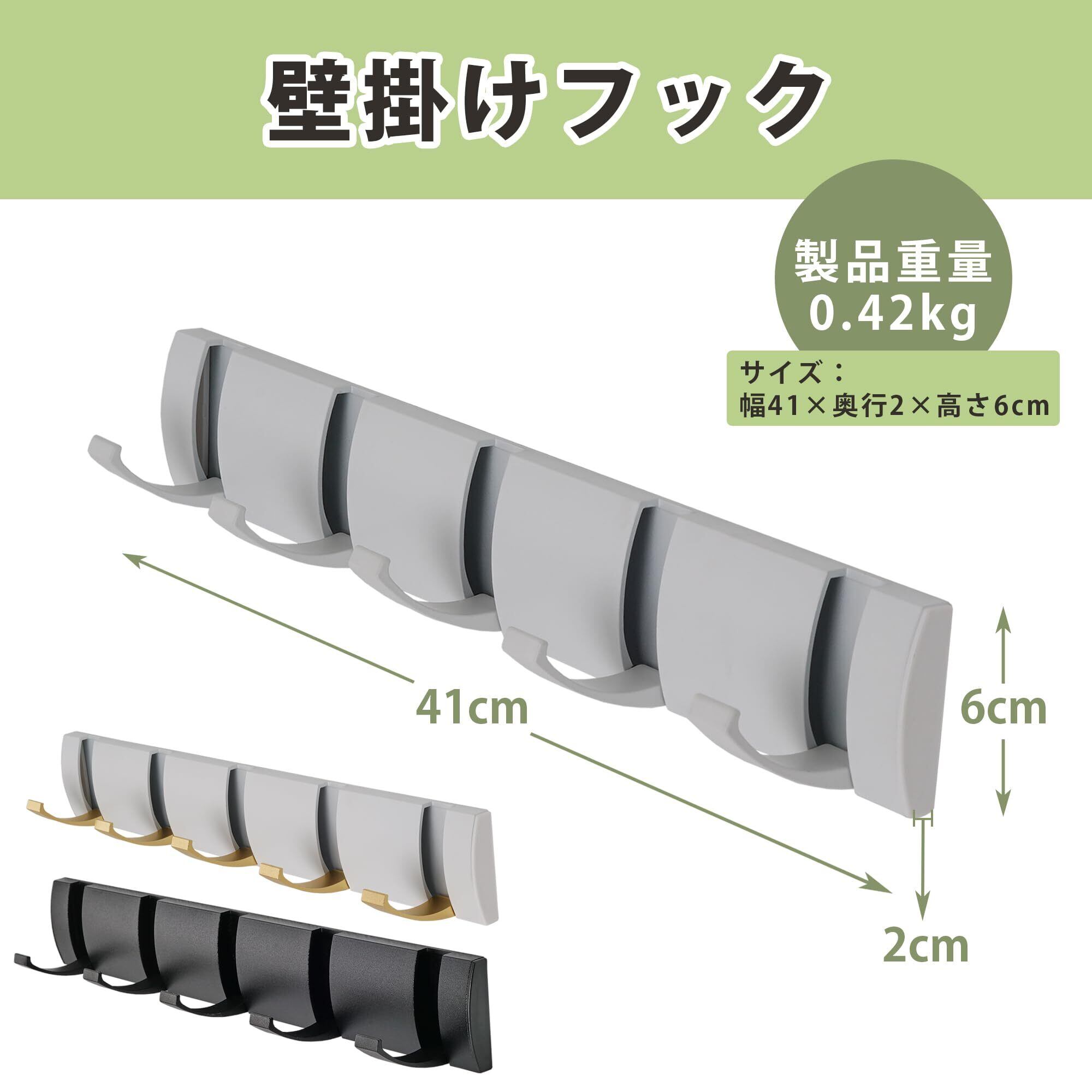 【省スペース設計】:このフックは連体型のデザインで、複数のアイテムを一度に掛けられます。このフックは壁面のスペースを有効活用でき、整頓された空間を保つことができます。このフックは設置場所に応じて、自由に取り付け方法を選べるのも大きなメリットです。