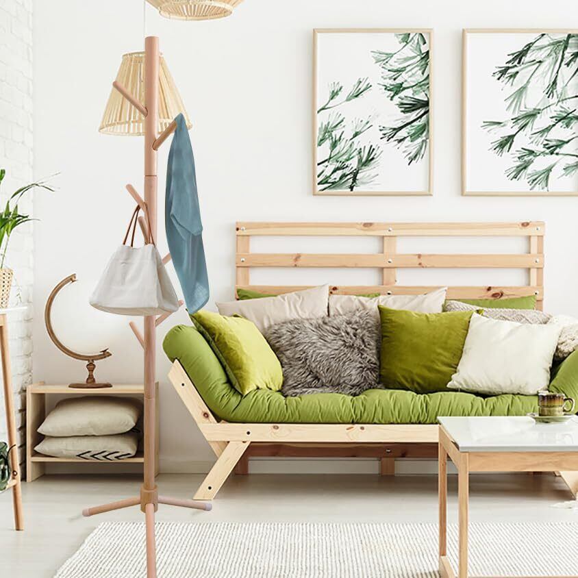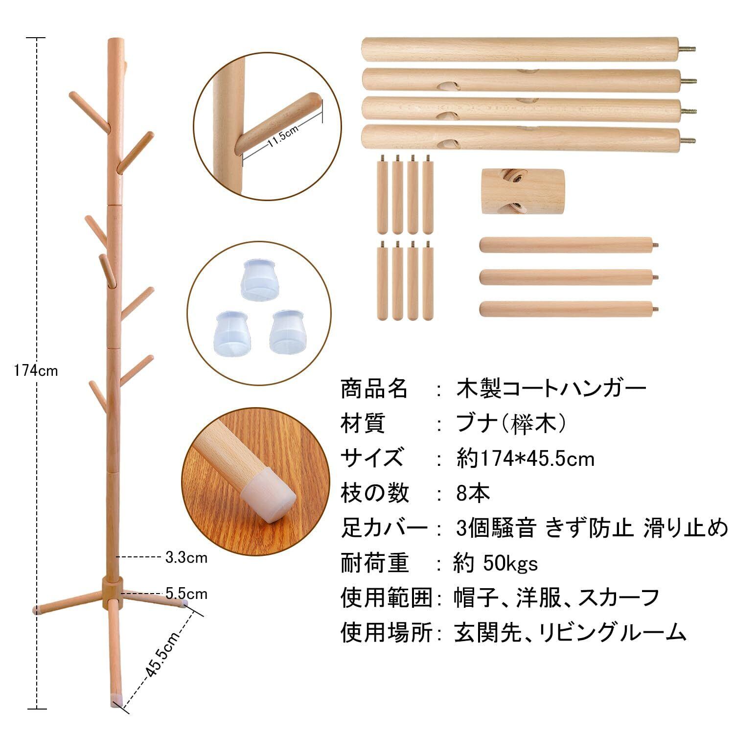 【天然木の質感】 材料は、柔らかい松ではなく、より高価な硬くて滑らかなブナです。天然の木を加工して出来たポールハンガーですので、表面は手触り良く滑らかな仕上がりで、丈夫である。環境に優しい塗装、ホルムアルデヒドなし。樹木の外観は自然の美しさを持っています。