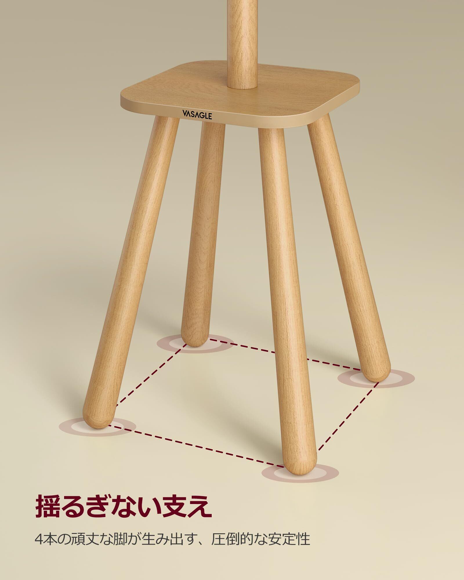 ✨【天然素材の温かみ】このポールハンガーは、高品質の木材を使用した天然木のデザインが特徴です。原木色の仕上げは、どんなインテリアにも調和し、ナチュラルな雰囲気を演出します。