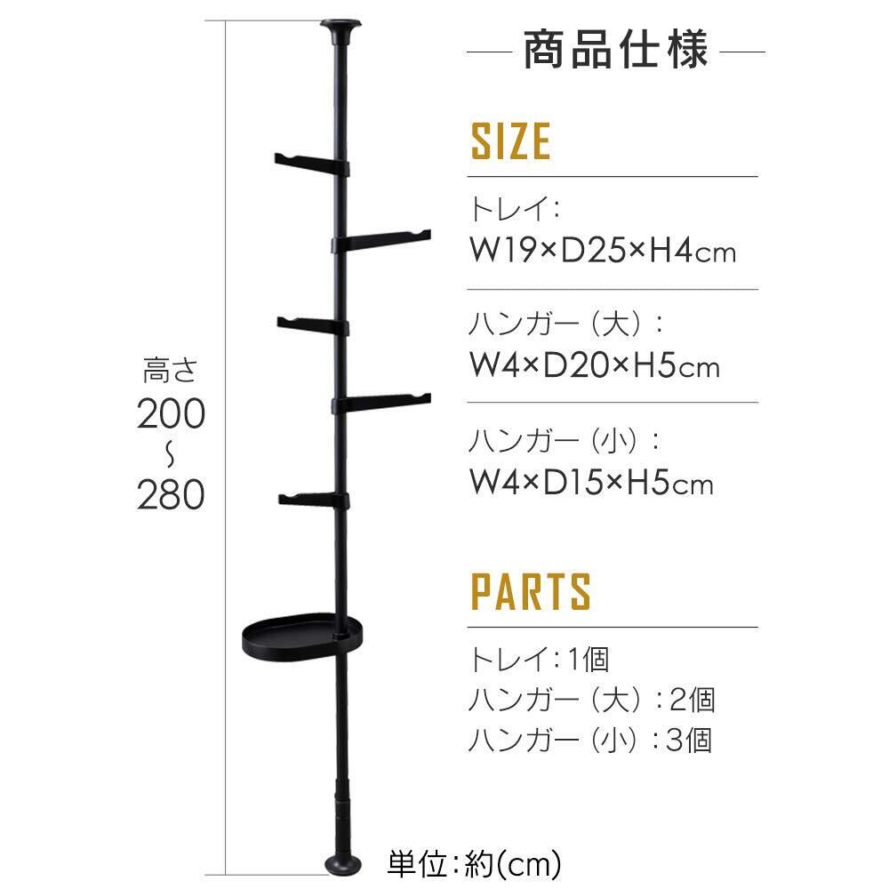商品サイズ(cm)/棒単品:幅約8×奥行約8×高さ約200-280、トレイ:幅約19×奥行約25×高さ約4、ハンガー(大):幅約4×奥行約20×高さ約5、ハンガー(小):幅約4×奥行約15×高さ約5