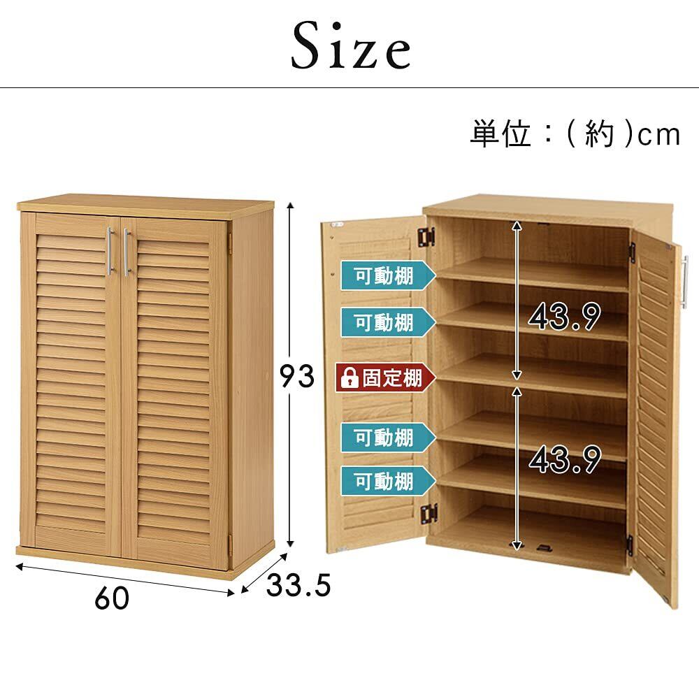 ✨ルーバー仕様のドアが施されているため、通気性に優れ、靴の湿気を防ぐ設計がポイントです。大切な靴を清潔に保ちながら、心地よいアンティークな印象を与えます。
