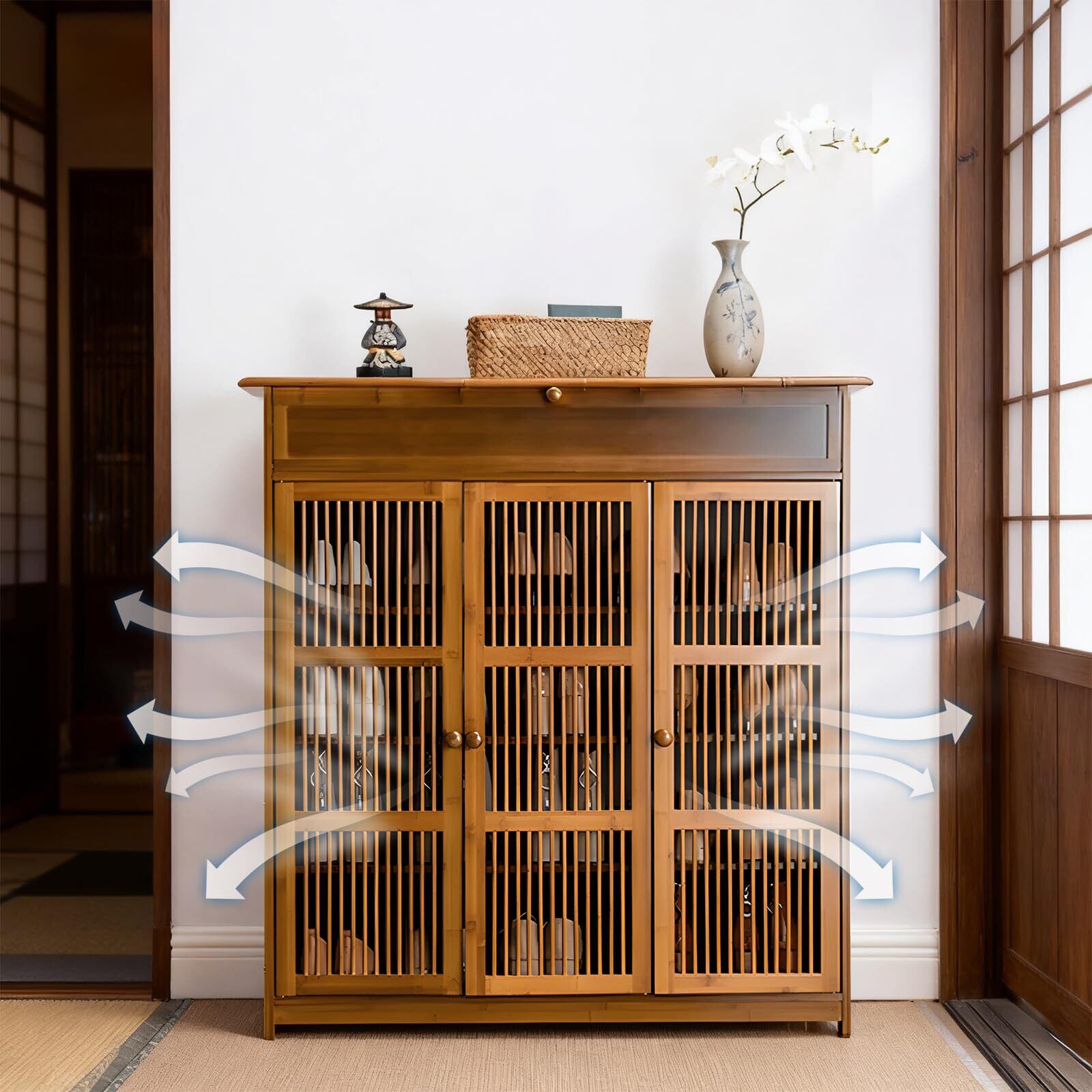 シューズボックス 下駄箱 天然竹製 シューズキャビネット スリム シューズラック 4段 靴箱 靴収納 扉付き 大容量 玄関収納 おしゃれ 靴収納 キャビネット 省スペース 通気性 ルーバー式 3扉タイプ 廊下 洗面所 玄関 アクセス リビングルーム 100cm×35cm×99cm (ブラウン)