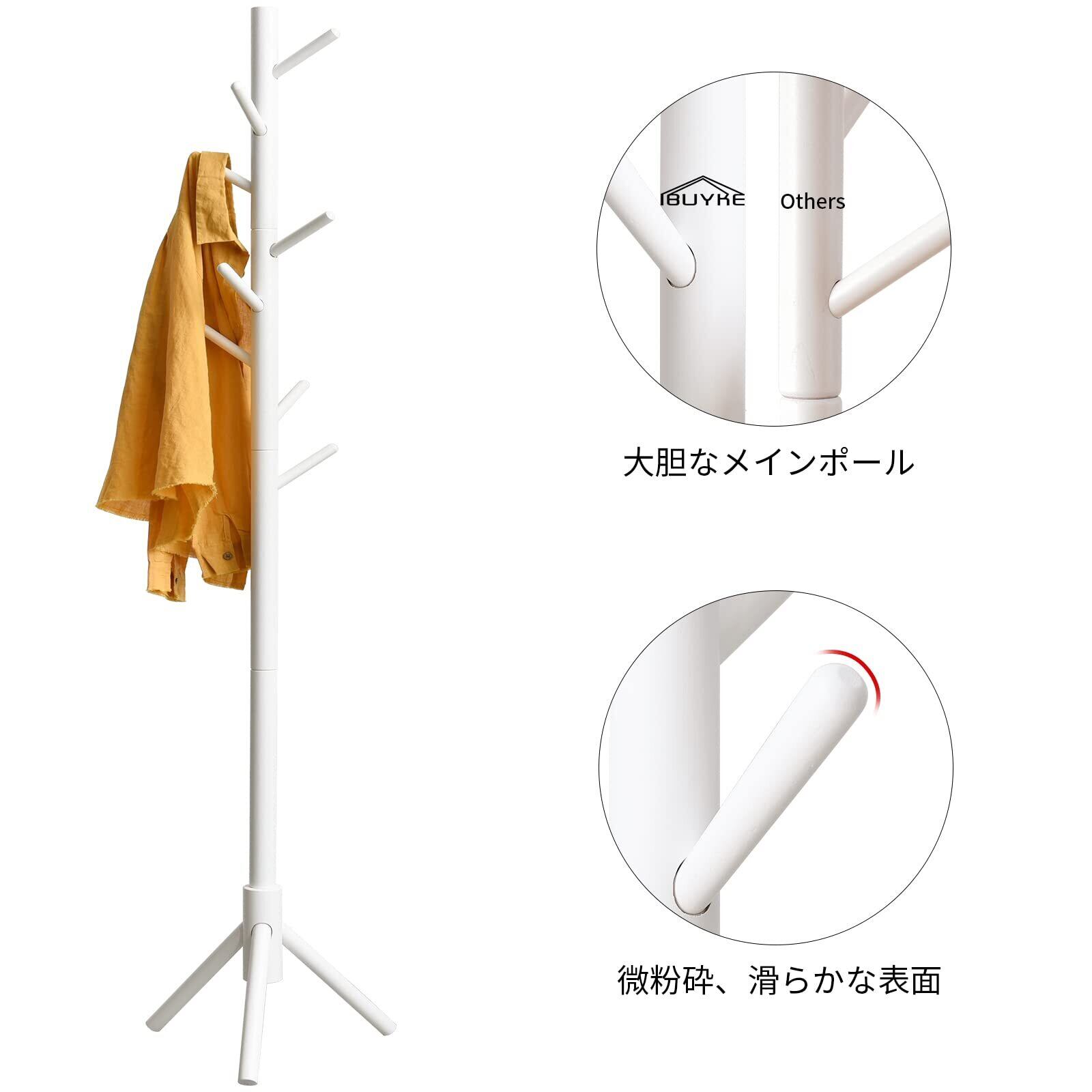 IBUYKE ポールハンガー おしゃれ コンパクト 衣類収納 木製 コートハンガー 落ちにくい 倒れにくい キッズポールハンガーへ変更可能 枝型フック設計 高さ183cm 組立て簡単 ホワイト JPRF-1194