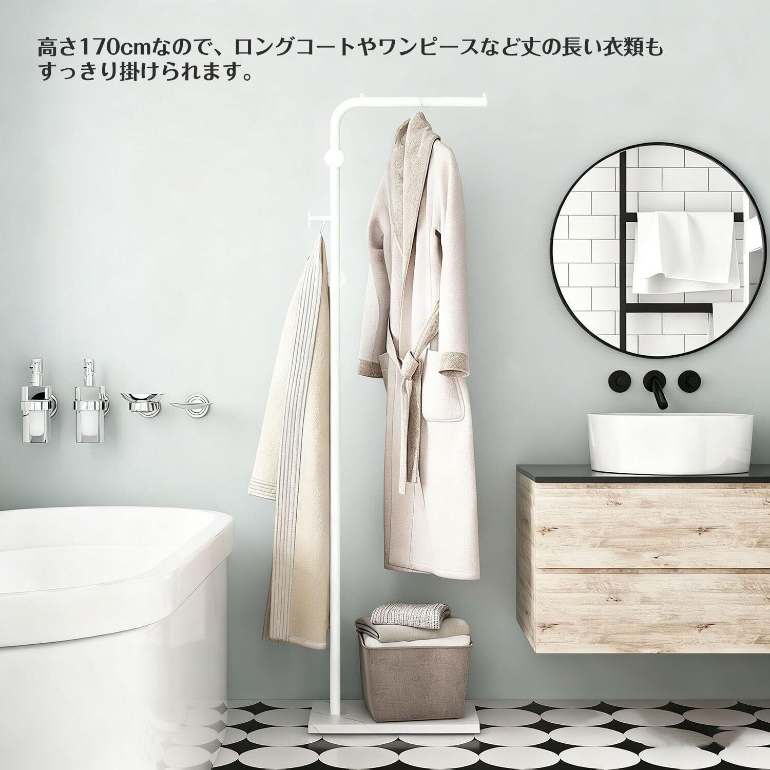 ✨【洗練されたデザインと高機能】このポールハンガーは、高さ170cmのスリムなデザインが特徴。白色のフレームがどんなインテリアにも調和し、コートやバッグを魅力的に見せる収納を実現します。