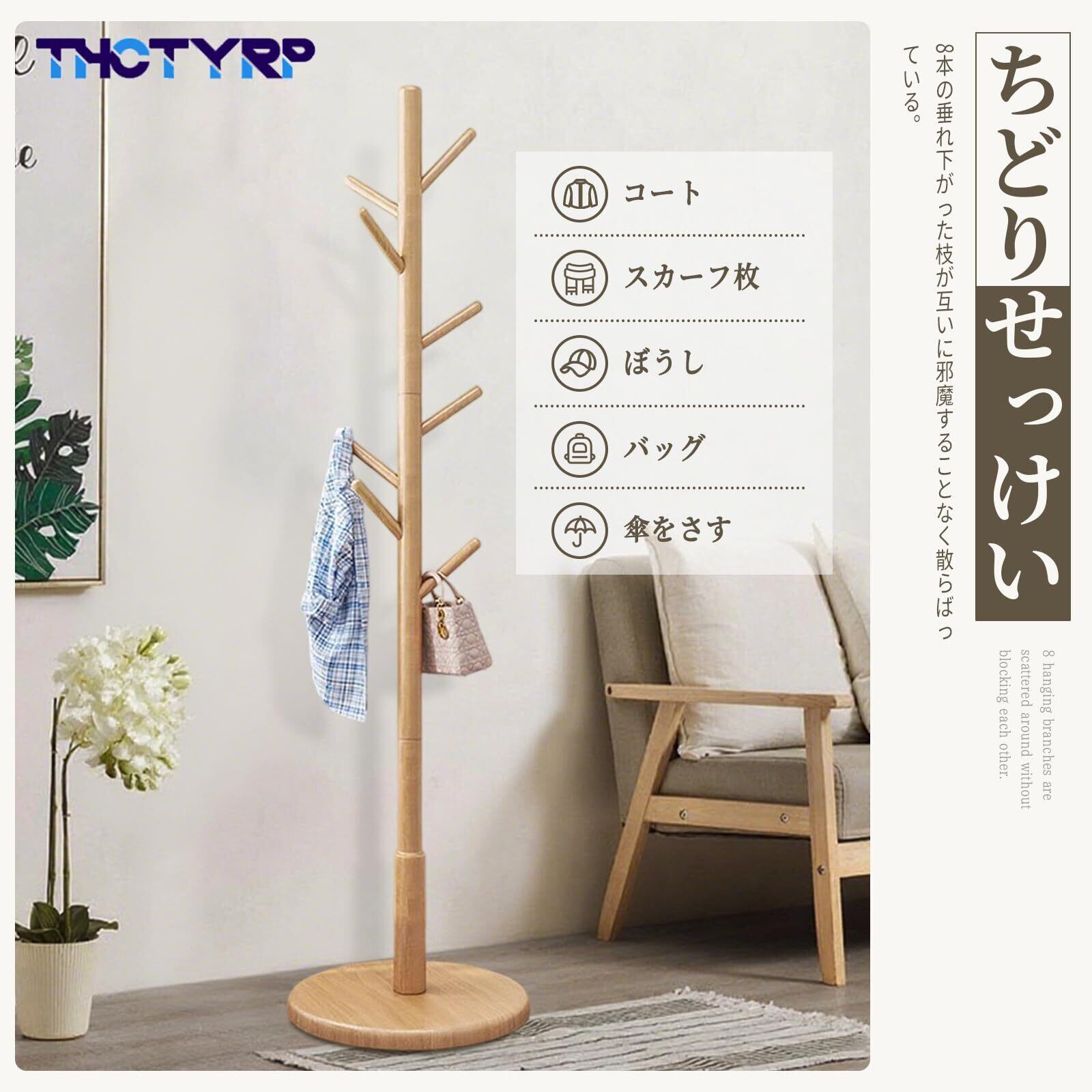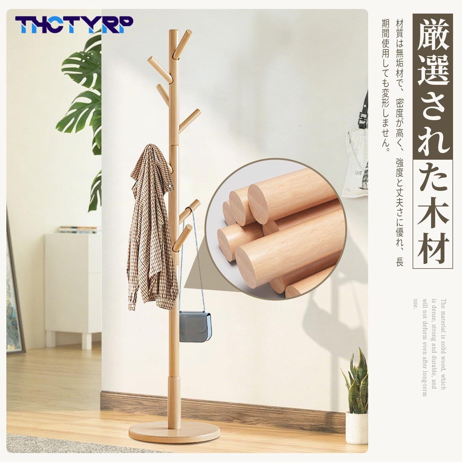コートハンガー、木製おしゃれ丸底ハンガーラック、ック スリム おしゃれ コートハンガー 天然木 静電気防止 4段 高さ175cm 高さ調節可能 安定 組み立て簡単 8つのフック 丸いベースは地面との接触面積が大きく 転倒しません 帽子掛け 洋服ラック 衣架 玄関 リビング 寝室用 (木の色)