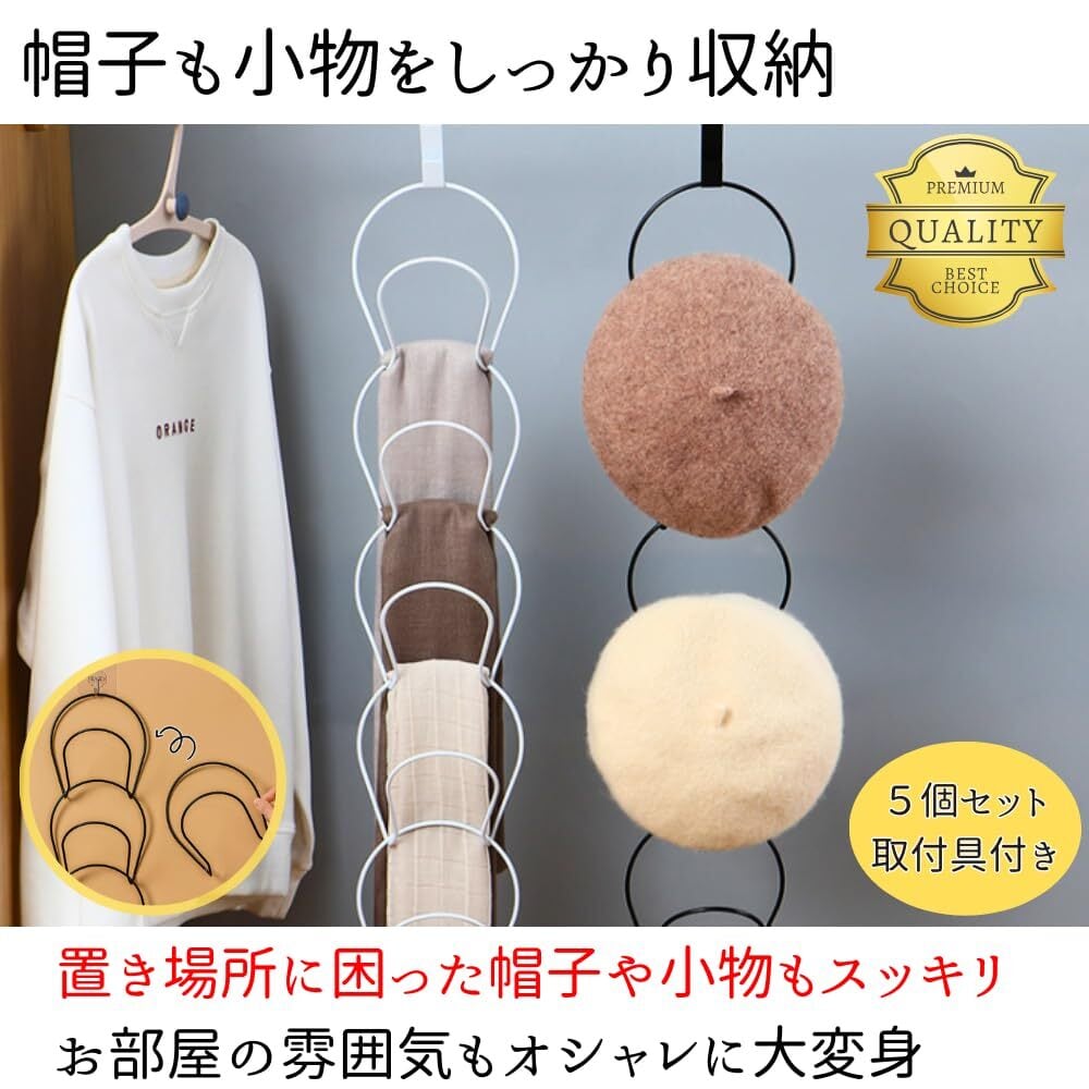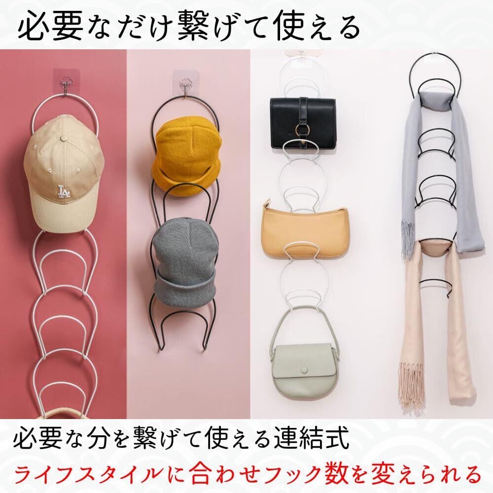 ✨5個のフックがセットになっているので、帽子からキャップ、その他のアクセサリーまで、多様なアイテムをすっきりと収納できます。限られたスペースを有効活用して、見た目もすっきり!
