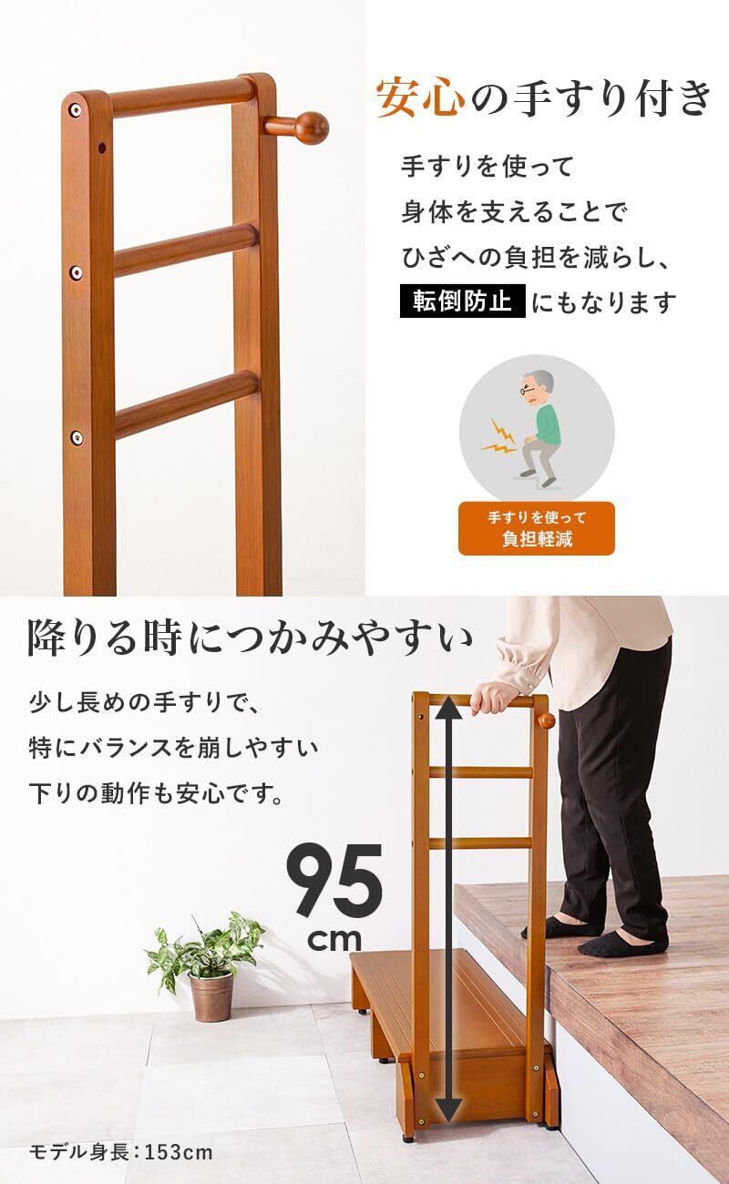 【安心で便利な手すり付き】:少し長めの手すりを採用しており、特にバランスを崩しやすい下りの動作も安心です。手すりを使って体を支えることで、膝への負担を減らし、転倒防止にもなります。