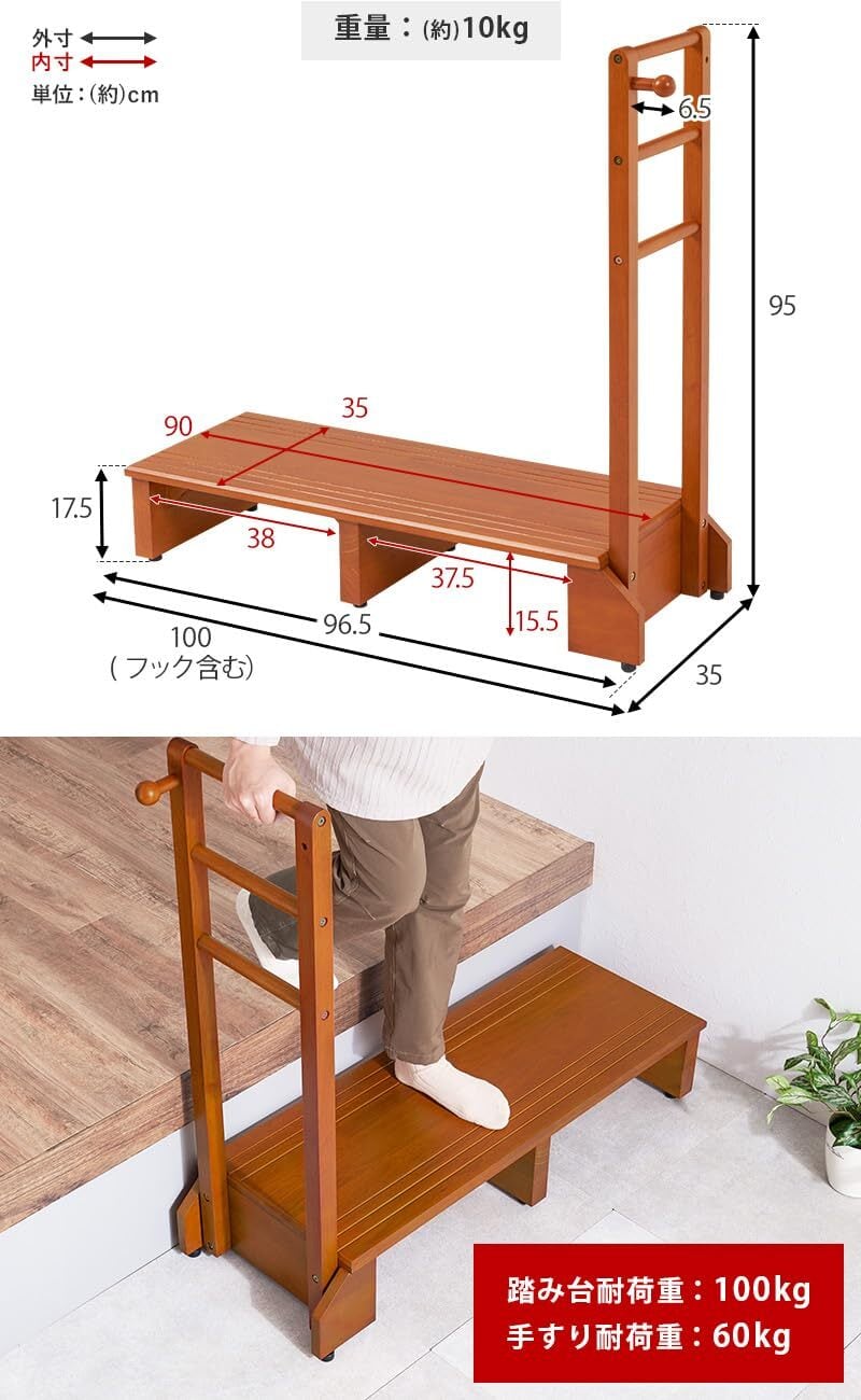 【頑丈な構造で安心】:踏み台耐荷重約100㎏、手すり耐荷重約60gkと頑丈でしっかりとした造りなので大柄な方も安心してお使いいただけます。