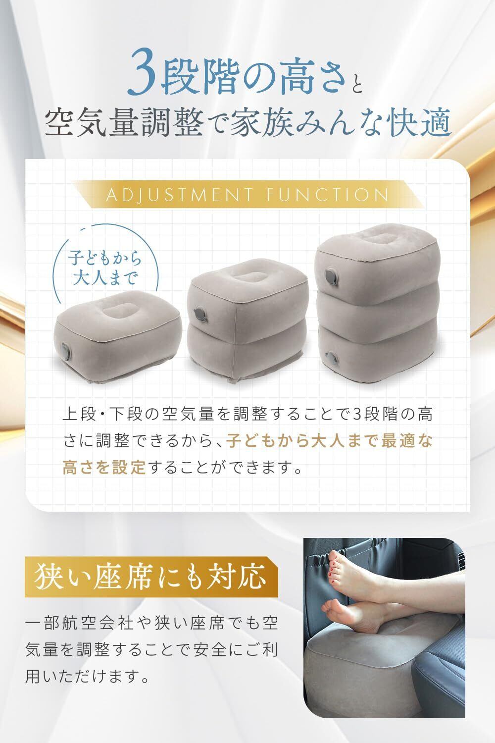 ✨飛行機の中だけでなく、お車の中でも使用できるため、長時間のドライブや旅行にぴったりです。エアークッションが足を支え、快適な姿勢をキープします。
