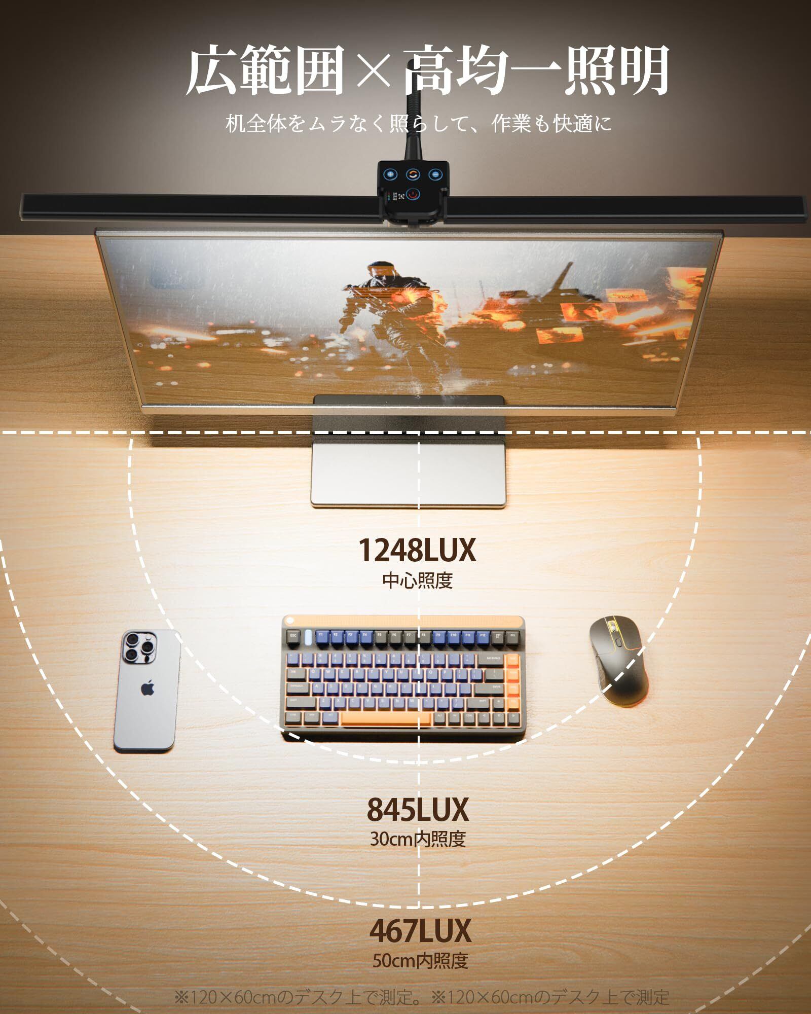 【自在な角度調節・モニター後方スペース活用】ダブルヘッドは360°回転、0〜180°開閉可能。フレキシブルアームは上下左右に自在に動き、好みの位置に簡単調整。最大70cmの高さで、モニター後方のスペースまで有効活用でき、デスクをすっきり広く使える。従来のモニターライトのように画面に直接取り付けて圧迫することがなく、画面を傷つける心配もない。