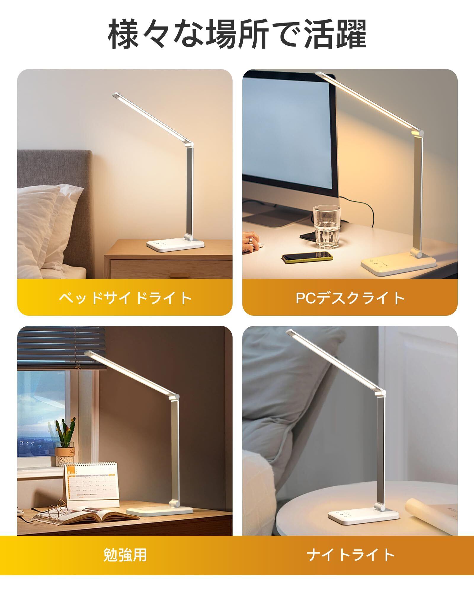 【5段階調色デスクライト・10段階調光】2024年の新型デスクライト led として、お好みの明るさを無段階に調節できます。電気スタンドは読書、仕事、リラックスタイムなどに適していっます。シーンに合わせて、最適な照明を自由に設定できる。勉強 ライトとして、目に優しく、長時間使っても快適な明るさを見つけることができる電気スタンド 卓上です。そして、デスクライトは電球色(3000 K)、温白色(4000 K)、白色(4500 K)、昼白色(5000 K)、日光色(6000 K)の5種類の色温度を選択することができます。さらに、デスクライトスイッチに軽く触れるだけで点灯、消灯を操作できます。タッチセンサーをスライドさせたり、タップしたりすることで、簡単に明るさを調節できるスタンドライト デスクです。仕事でも休憩でも、さまざまなシーンに適した、最適な照明環境を備えたデスクスタンドです。